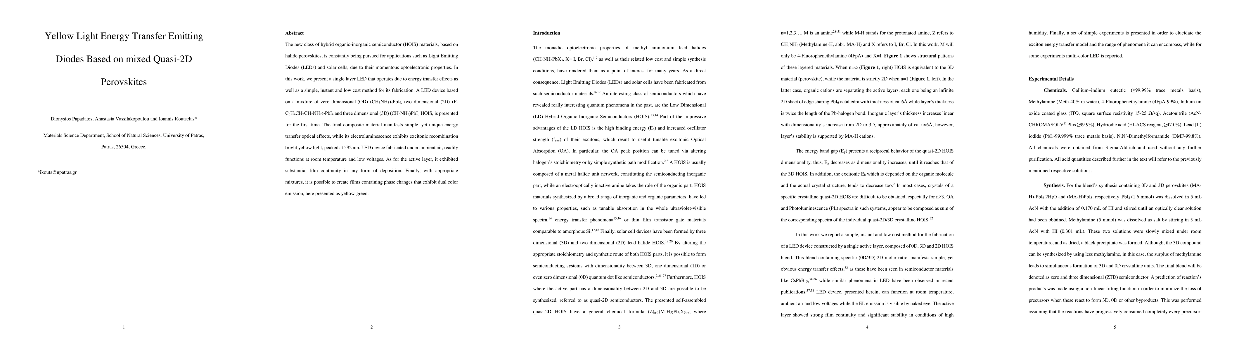The new class of hybrid organic-inorganic semiconductor (HOIS) materials, based on halide perovskites, is constantly being pursued for applications such as Light Emitting Diodes (LEDs) and solar cells, due to their momentous optoelectronic properties. In this work, we present a single layer LED that operates due to energy transfer effects as well as a simple, instant and low cost method for its fabrication. A LED device based on a mixture of zero dimensional (OD) (CH 3 NH 3 ) 4 PbI 6, two dimensional (2D) (F- C 6 H 4 CH 2 CH 2 NH 2 ) 2 PbI 4 and three dimensional (3D) (CH 3 NH 3 )PbI 3 HOIS, is presented for the first time. The final composite material manifests simple, yet unique energy transfer optical effects, while its electroluminescence exhibits excitonic recombination bright yellow light, peaked at 592 nm. LED device fabricated under ambient air, readily functions at room temperature and low voltages. As for the active layer, it exhibited substantial film continuity in any form of deposition. Finally, with appropriate mixtures, it is possible to create films containing phase changes that exhibit dual color emission, here presented as yellow-green.