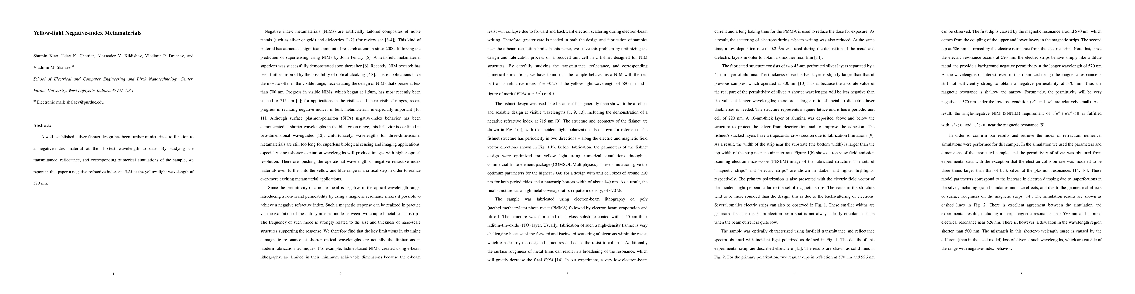 A well-established, silver fishnet design has been further miniaturized to function as a negative-index material at the shortest wavelength to date. By studying the transmittance, reflectance, and corresponding numerical simulations of the sample, we report in this paper a negative refractive index of -0.25 at the yellow-light wavelength of 580 nm.