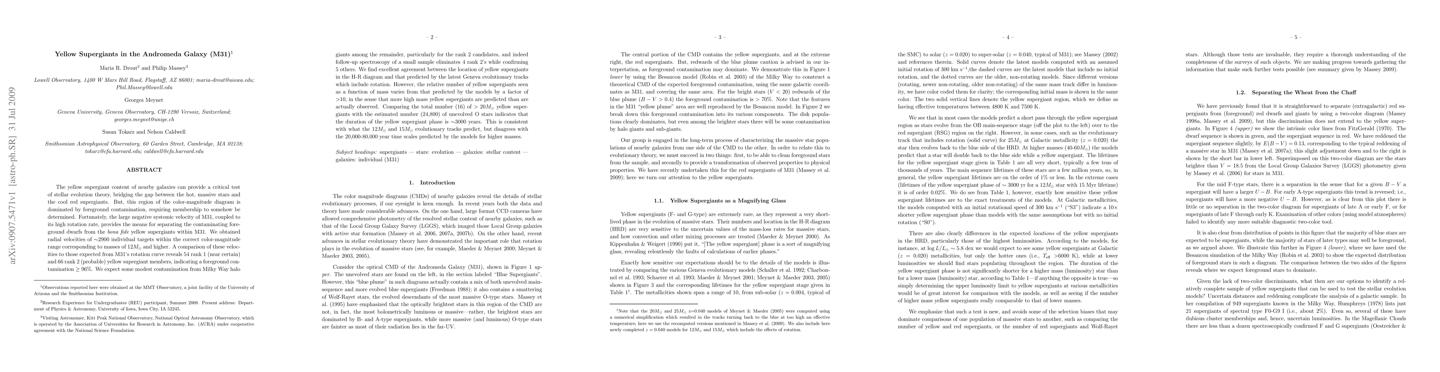 The yellow supergiant content of nearby galaxies can provide a critical test of stellar evolution theory, bridging the gap between the hot, massive stars and the cool red supergiants. But, this region of the color-magnitude diagram is dominated by foreground contamination, requiring membership to somehow be determined. Fortunately, the large negative systemic velocity of M31, coupled to its high rotation rate, provides the means for separating the contaminating foreground dwarfs from the bona fide yellow supergiants within M31. Using the MMT, we obtained spectra of about 2900 stars, selected using the color and magnitude range to be yellow supergiants. Comparing the velocities to that of M31's rotation curve, we identified 54 certain, and 66 probable yellow supergiants from among the sea of foreground dwarfs. We find excellent agreement between the location of yellow supergiants in the H-R diagram and that predicted by the latest Geneva evolutionary tracks which include rotation. However, the relative number of yellow supergiants seen as a function of mass varies from that predicted by the models by a factor of more than 10, in the sense that more high mass yellow supergiants are predicted than are actually observed. Comparing the total number of yellow supergiants with masses above 20Mo with the estimated number of unevolved O stars indicates that the duration of the yellow supergiant phase is about 3000 years. This is consistent with what the 12Mo and 15Mo evolutionary tracks predict, but disagrees with the 20,000-80,000 year time scales predicted by the models for higher masses.