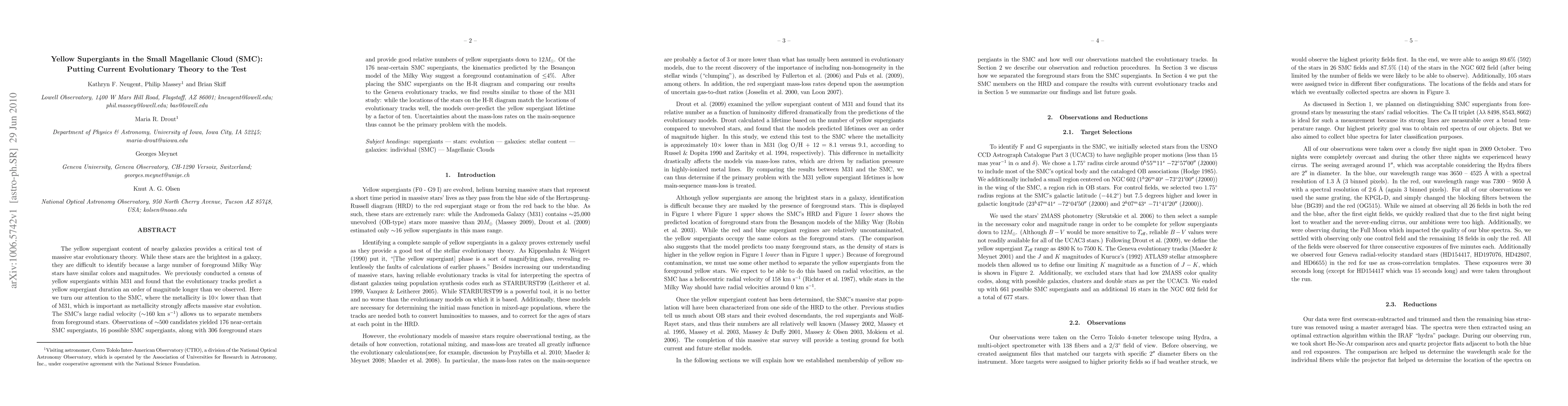 The yellow supergiant content of nearby galaxies provides a critical test of massive star evolutionary theory. While these stars are the brightest in a galaxy, they are difficult to identify because a large number of foreground Milky Way stars have similar colors and magnitudes. We previously conducted a census of yellow supergiants within M31 and found that the evolutionary tracks predict a yellow supergiant duration an order of magnitude longer than we observed. Here we turn our attention to the SMC, where the metallicity is 10x lower than that of M31, which is important as metallicity strongly affects massive star evolution. The SMC's large radial velocity (~160 km/s) allows us to separate members from foreground stars. Observations of ~500 candidates yielded 176 near-certain SMC supergiants, 16 possible SMC supergiants, along with 306 foreground stars and provide good relative numbers of yellow supergiants down to 12Mo. Of the 176 near-certain SMC supergiants, the kinematics predicted by the Besancon model of the Milky Way suggest a foreground contamination of >4%. After placing the SMC supergiants on the H-R diagram and comparing our results to the Geneva evolutionary tracks, we find results similar to those of the M31 study: while the locations of the stars on the H-R diagram match the locations of evolutionary tracks well, the models over-predict the yellow supergiant lifetime by a factor of ten. Uncertainties about the mass-loss rates on the main-sequence thus cannot be the primary problem with the models.