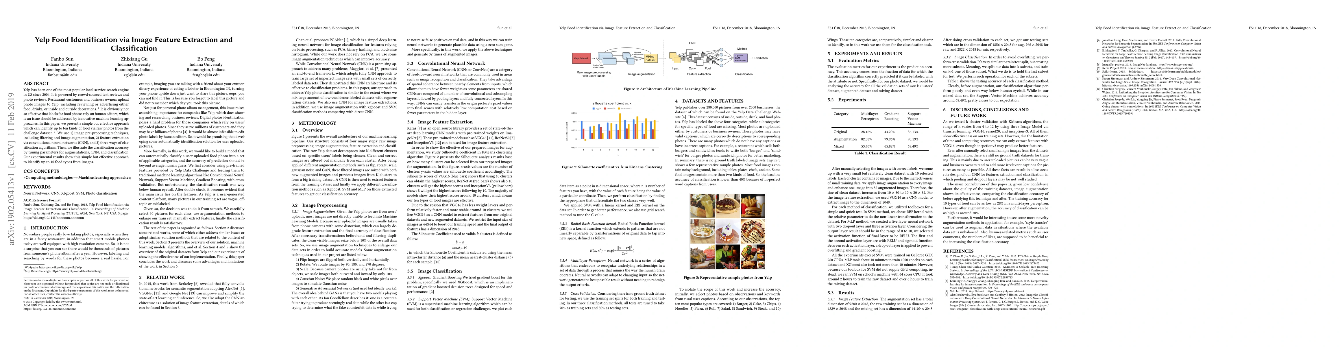 Yelp has been one of the most popular local service search engine in US since 2004. It is powered by crowd-sourced text reviews and photo reviews. Restaurant customers and business owners upload photo images to Yelp, including reviewing or advertising either food, drinks, or inside and outside decorations. It is obviously not so effective that labels for food photos rely on human editors, which is an issue should be addressed by innovative machine learning approaches. In this paper, we present a simple but effective approach which can identify up to ten kinds of food via raw photos from the challenge dataset. We use 1) image pre-processing techniques, including filtering and image augmentation, 2) feature extraction via convolutional neural networks (CNN), and 3) three ways of classification algorithms. Then, we illustrate the classification accuracy by tuning parameters for augmentations, CNN, and classification. Our experimental results show this simple but effective approach to identify up to 10 food types from images.