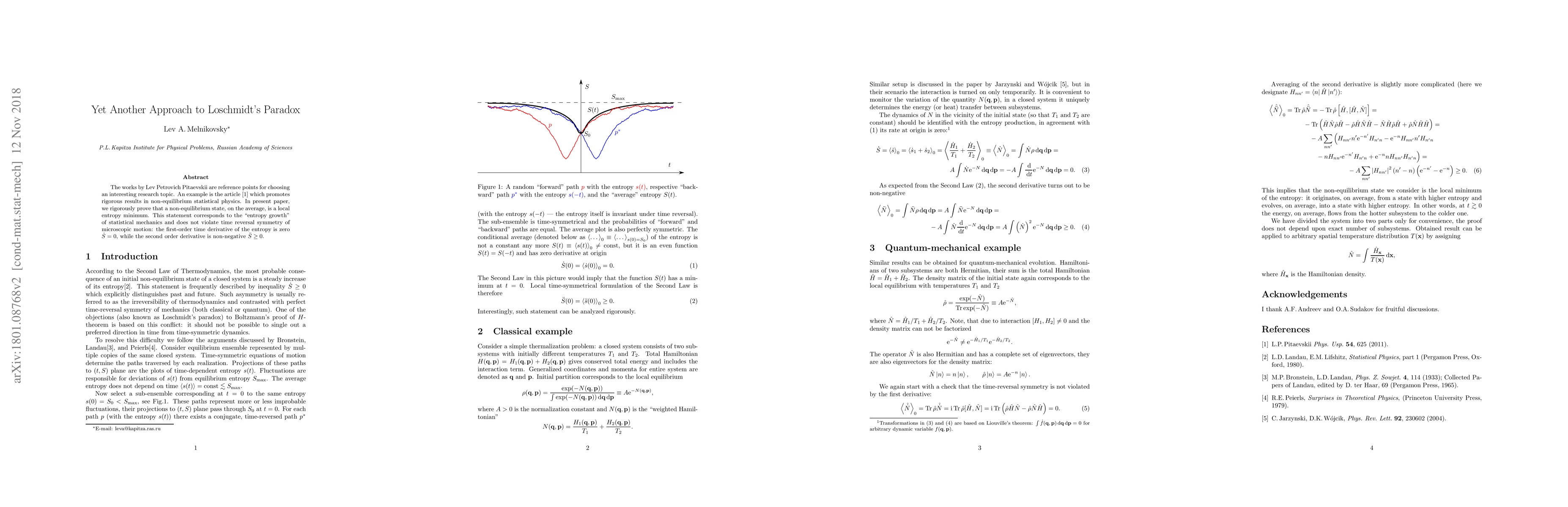 The works by Lev Petrovich Pitaevskii are reference points for choosing an interesting research topic. An example is the article [Phys. Usp. Vol.54, pp.625-632, 2011] https://doi.org/10.3367/UFNe.0181.201106d.0647 which promotes rigorous results in non-equilibrium statistical physics. In present paper, we rigorously prove that a non-equilibrium state, on the average, is a local entropy minimum. This statement corresponds to the "entropy growth" of statistical mechanics and does not violate time reversal symmetry of microscopic motion: the first-order time derivative of the entropy is zero $\dot{S}=0$, while the second order derivative is non-negative $\ddot{S}\ge 0$.