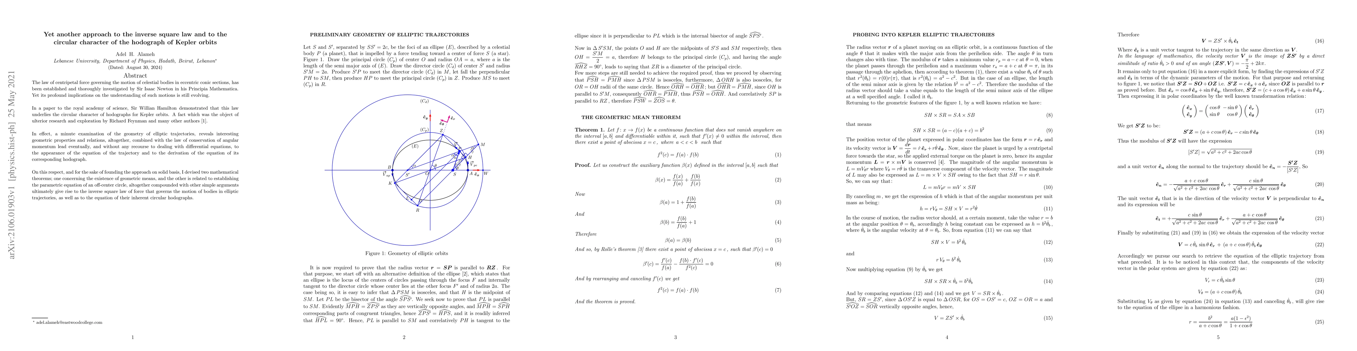 The law of centripetal force governing the motion of celestial bodies in eccentric conic sections, has been established and thoroughly investigated by Sir Isaac Newton in his Principia Mathematica. Yet its profound implications on the understanding of such motions is still evolving. In a paper to the royal academy of science, Sir Willian Hamilton demonstrated that this law underlies the circular character of hodographs for Kepler orbits. A fact which was the object of ulterior research and exploration by Richard Feynman and many other authors [1]. In effect, a minute examination of the geometry of elliptic trajectories, reveals interesting geometric properties and relations, altogether, combined with the law of conservation of angular momentum lead eventually, and without any recourse to dealing with differential equations, to the appearance of the equation of the trajectory and to the derivation of the equation of its corresponding hodograph. On this respect, and for the sake of founding the approach on solid basis, I devised two mathematical theorems; one concerning the existence of geometric means, and the other is related to establishing the parametric equation of an off-center circle, altogether compounded with other simple arguments ultimately give rise to the inverse square law of force that governs the motion of bodies in elliptic trajectories, as well as to the equation of their inherent circular hodographs.