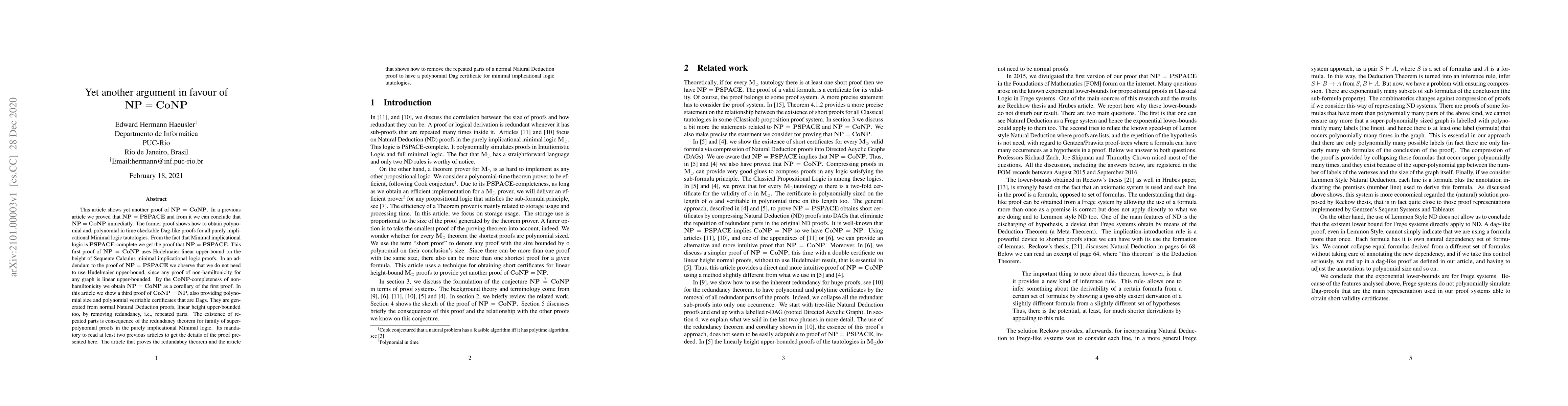 This article shows yet another proof of NP=CoNP$. In a previous article, we proved that NP=PSPACE and from it we can conclude that NP=CoNP immediately. The former proof shows how to obtain polynomial and, polynomial in time checkable Dag-like proofs for all purely implicational Minimal logic tautologies. From the fact that Minimal implicational logic is PSPACE-complete we get the proof that NP=PSPACE. This first proof of NP=CoNP uses Hudelmaier linear upper-bound on the height of Sequent Calculus minimal implicational logic proofs. In an addendum to the proof of NP=PSPACE, we observe that we do not need to use Hudelmaier upper-bound since any proof of non-hamiltonicity for any graph is linear upper-bounded. By the CoNP-completeness of non-hamiltonicity, we obtain NP=CoNP as a corollary of the first proof. In this article we show the third proof of CoNP=NP, also providing polynomial size and polynomial verifiable certificates that are Dags. They are generated from normal Natural Deduction proofs, linear height upper-bounded too, by removing redundancy, i.e., repeated parts. The existence of repeated parts is a consequence of the redundancy theorem for a family of super-polynomial proofs in the purely implicational Minimal logic. It is mandatory to read at least two previous articles to get the details of the proof presented here. The article that proves the redundancy theorem and the article that shows how to remove the repeated parts of a normal Natural Deduction proof to have a polynomial Dag certificate for minimal implicational logic tautologies.