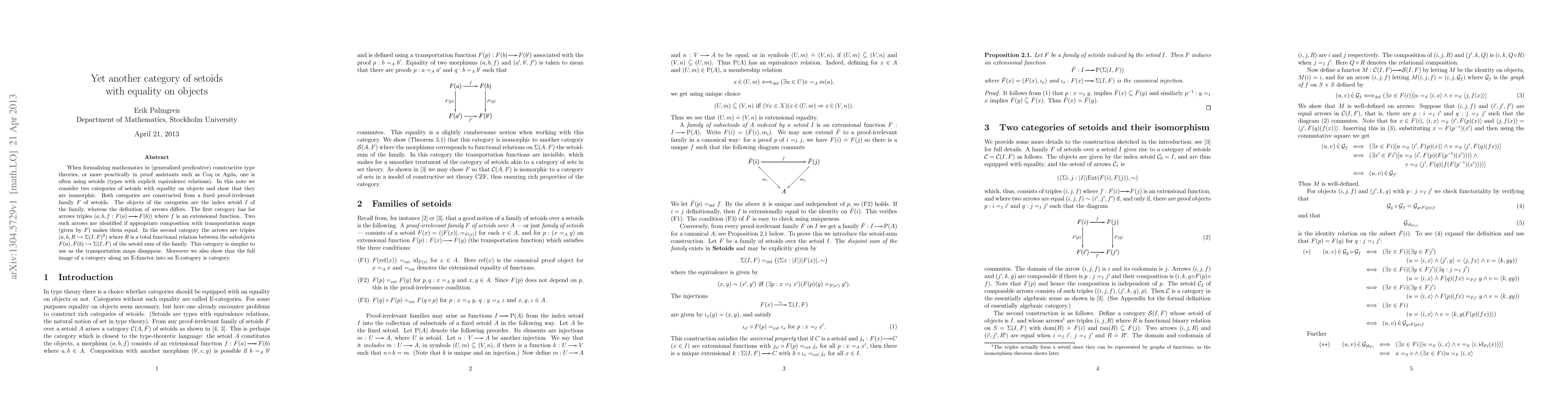 When formalizing mathematics in (generalized predicative) constructive type theories, or more practically in proof assistants such as Coq or Agda, one is often using setoids (types with explicit equivalence relations). In this note we consider two categories of setoids with equality on objects and show that they are isomorphic. Both categories are constructed from a fixed proof-irrelevant family $F$ of setoids. The objects of the categories are the index setoid $I$ of the family, whereas the definition of arrows differs. The first category has for arrows triples $(a,b,f:F(a) \to F(b))$ where $f$ is an extensional function. Two such arrows are identified if appropriate composition with transportation maps (given by $F$) makes them equal. In the second category the arrows are triples $(a,b,R \hookrightarrow \Sigma(I,F)^2)$ where $R$ is a total functional relation between the subobjects $F(a), F(b) \hookrightarrow \Sigma(I,F)$ of the setoid sum of the family. This category is simpler to use as the transportation maps disappear. Moreover we also show that the full image of a category along an E-functor into an E-category is category.