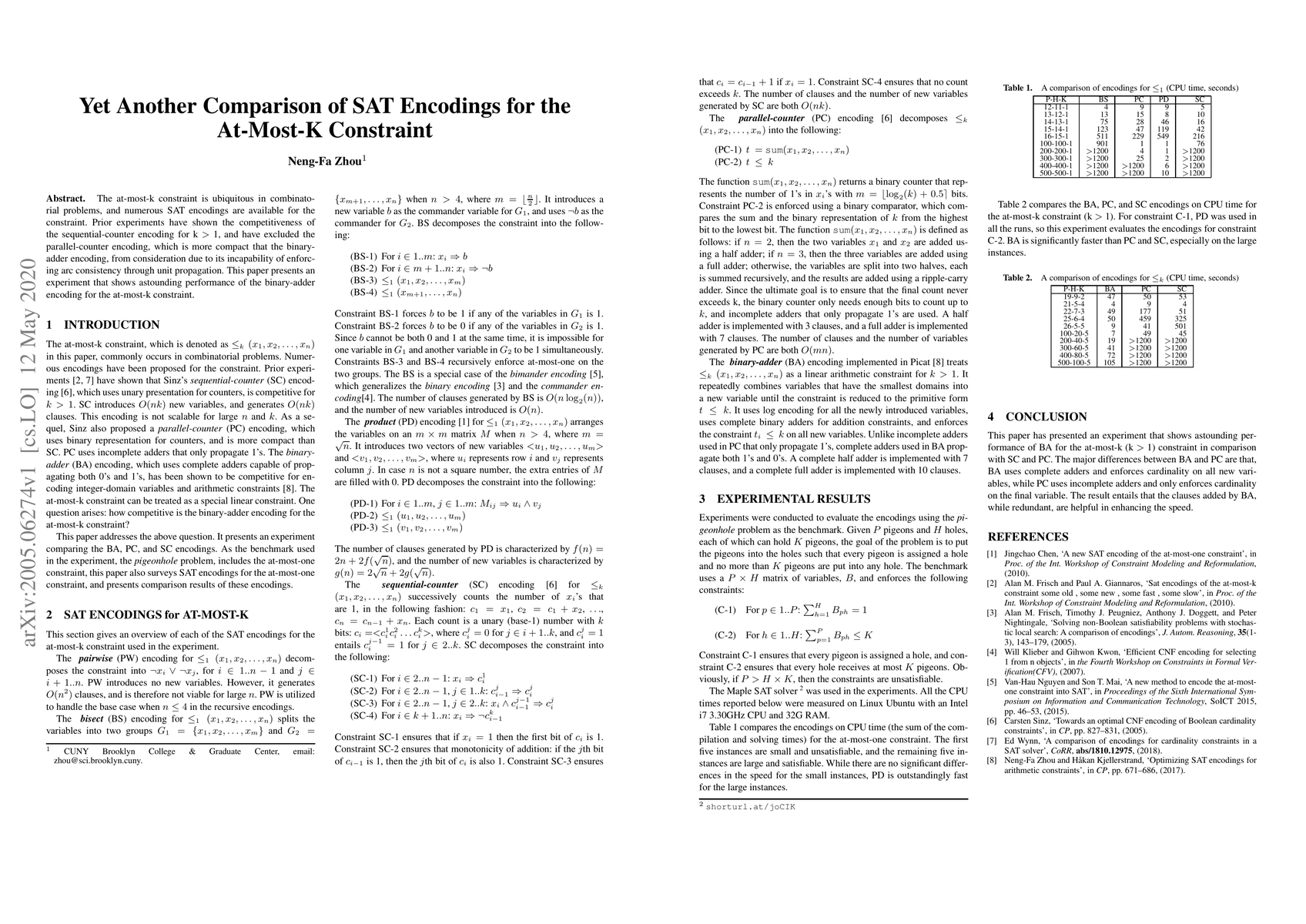 This research compares various SAT encodings for the at-most-k constraint, finding that the previously less favored binary-adder encoding outperforms other methods, challenging established preferences for the sequential-counter encoding.