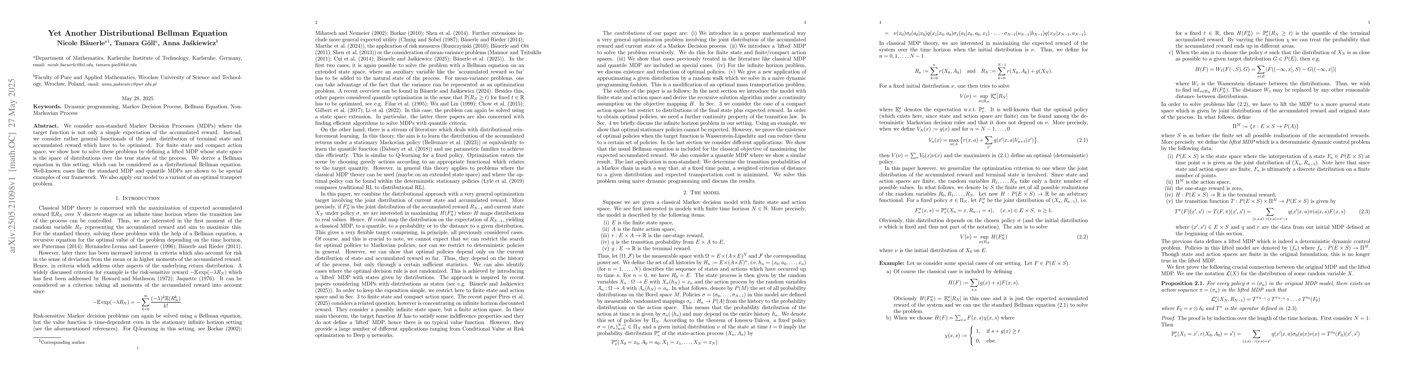 This paper introduces a new framework for solving Markov Decision Processes where the target function is not just a simple expectation of accumulated reward, but any general functional of joint distribution of terminal state and accumulated reward.