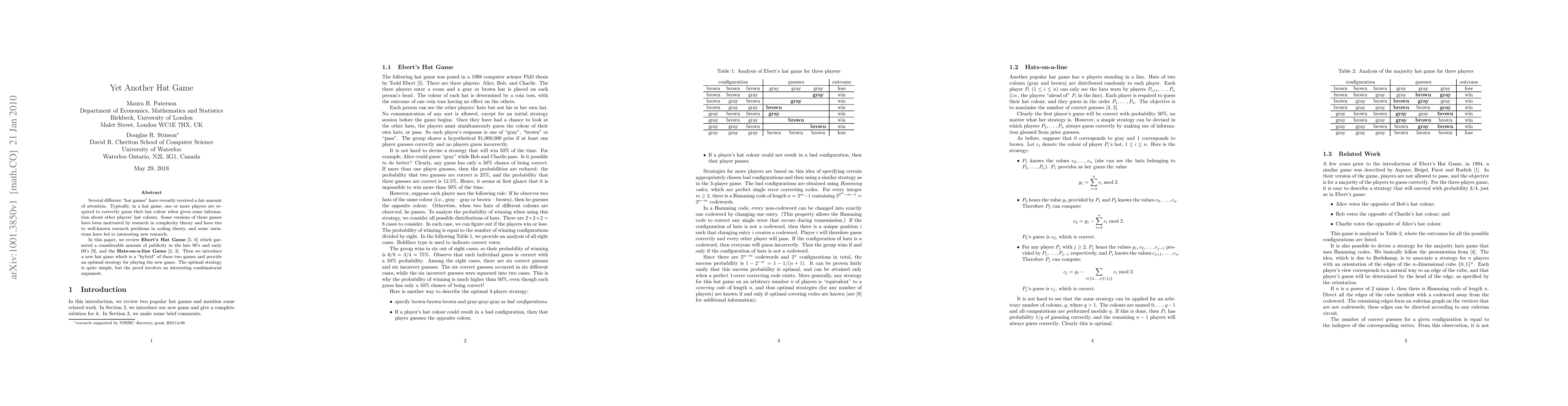Several different "hat games" have recently received a fair amount of attention. Typically, in a hat game, one or more players are required to correctly guess their hat colour when given some information about other players' hat colours. Some versions of these games have been motivated by research in complexity theory and have ties to well-known research problems in coding theory, and some variations have led to interesting new research. In this paper, we review Ebert's Hat Game, which garnered a considerable amount of publicity in the late 90's and early 00's, and the Hats-on-a-line Game. Then we introduce a new hat game which is a "hybrid" of these two games and provide an optimal strategy for playing the new game. The optimal strategy is quite simple, but the proof involves an interesting combinatorial argument.