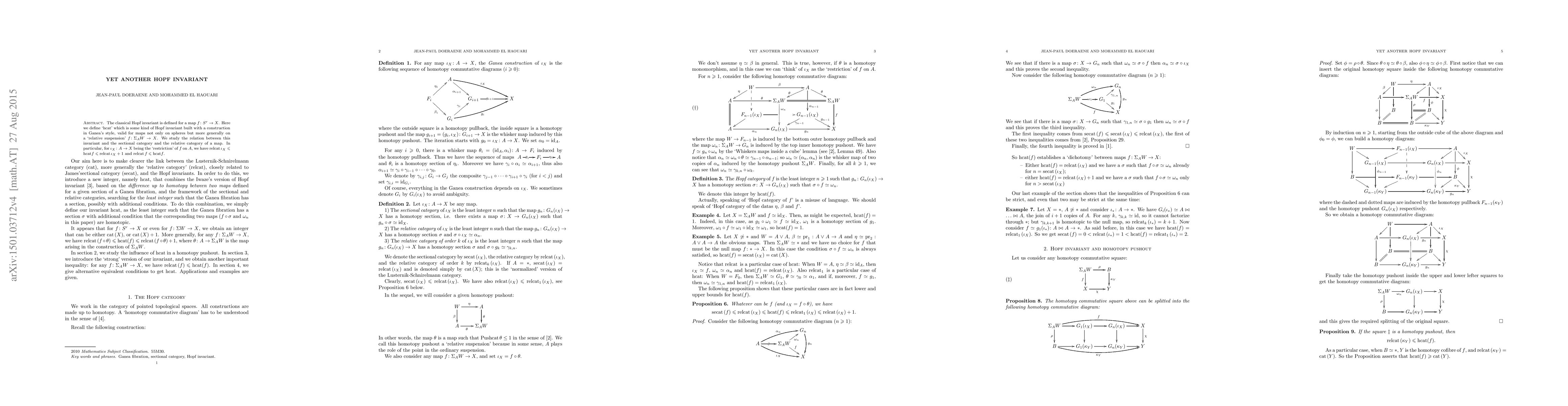 The classical Hopf invariant is defined for a map f: S^r -> X. Here we define `hcat' which is some kind of Hopf invariant built with a construction in Ganea's style, valid for maps not only on spheres but more generally on a `relative suspension' f: Sigma_A W -> X. We study the relation between this invariant and the sectional category and the relative category of a map. In particular, for f being the `restriction' of f on A, we have relcat(i) <= hcat(f) <= relcat(i) + 1 and relcat(f) <= hcat(f).