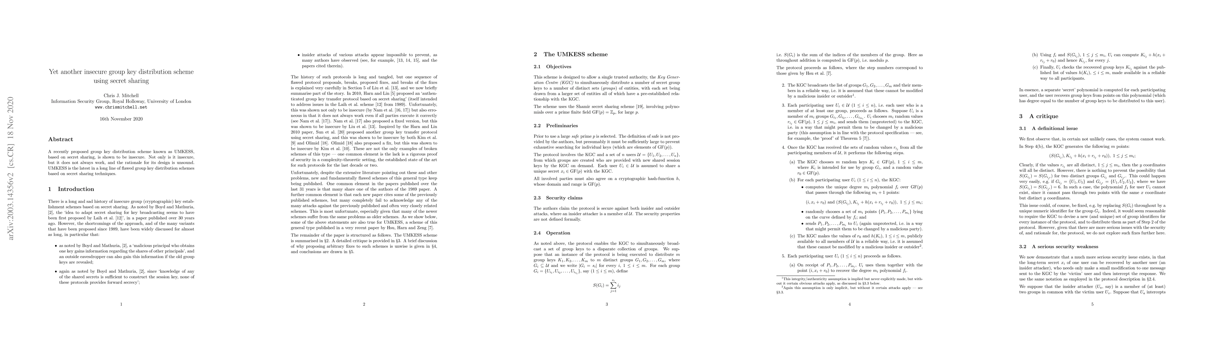 Summary: This paper demonstrates the insecurity of the UMKESS group key distribution scheme, which relies on secret sharing, and highlights its unreliability and flawed design rationale, contributing to a series of similar insecure group key distribution methods.