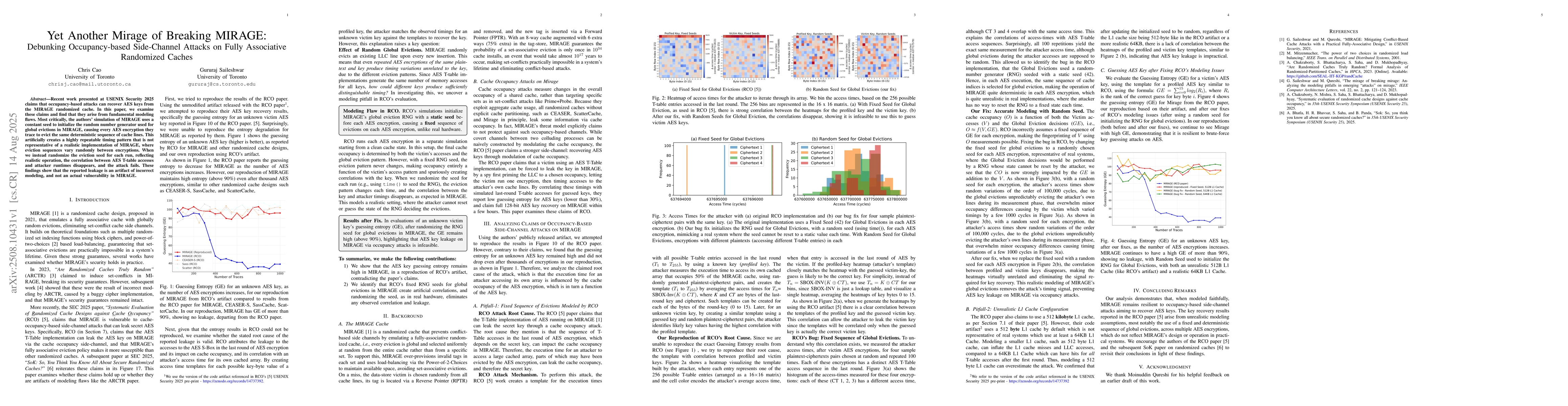 Recent work presented at USENIX Security 2025 claims that occupancy-based attacks can recover AES keys from the MIRAGE randomized cache. In this paper, we examine these claims and find that they arise from fundamental modeling flaws. Most critically, the authors' simulation of MIRAGE uses a constant seed to initialize the random number generator used for global evictions in MIRAGE, causing every AES encryption they trace to evict the same deterministic sequence of cache lines. This artificially creates a highly repeatable timing pattern that is not representative of a realistic implementation of MIRAGE, where eviction sequences vary randomly between encryptions. When we instead randomize the eviction seed for each run, reflecting realistic operation, the correlation between AES T-table accesses and attacker runtimes disappears, and the attack fails. These findings show that the reported leakage is an artifact of incorrect modeling, and not an actual vulnerability in MIRAGE.