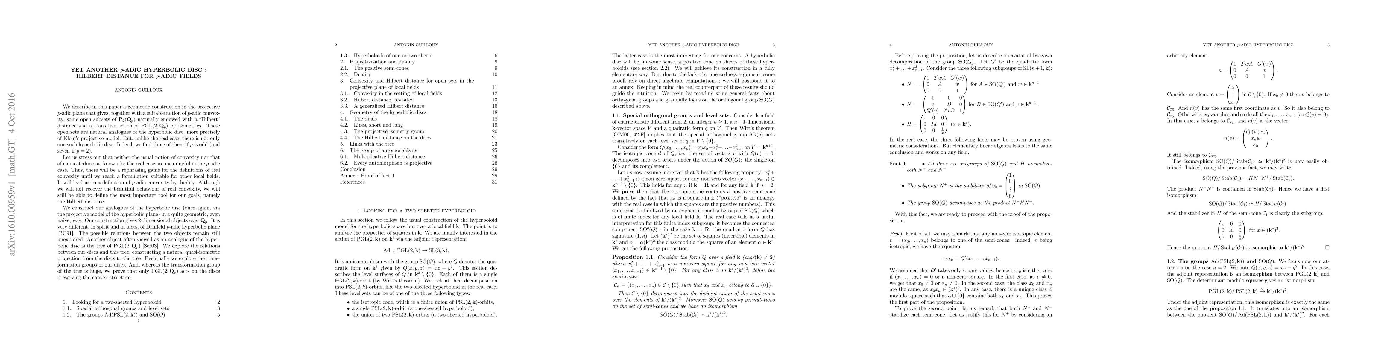 We describe in this paper a geometric construction in the projective p-adic plane that gives, together with a suitable notion of p-adic convexity, some open subsets of P 2 .Q p / naturally endowed with a "Hilbert" distance and a transitive action of PGL.2; Q p / by isometries. ese open sets are natural analogues of the hyperbolic disc, more precisely of Klein's projective model. But, unlike the real case, there is not only one such hyperbolic disc. Indeed, we nd three of them if p is odd (and seven if p D 2). Let us stress out that neither the usual notion of convexity nor that of connectedness as known for the real case are meaningful in the p-adic case. us, there will be a rephrasing game for the denitions of real convexity until we reach a formulation suitable for other local elds. It will lead us to a denition of p-adic convexity by duality. Although we will not recover the beautiful behaviour of real convexity, we will still be able to dene the most important tool for our goals, namely the Hilbert distance. We construct our analogues of the hyperbolic disc (once again, via the projective model of the hyperbolic plane) in a quite geometric, even naive, way. Our construction gives 2-dimensional objects over Q p. It is very dierent, in spirit and in facts, of Drinfeld p-adic hyperbolic plane []. e possible relations between the two objects remain still unexplored. Another object often viewed as an analogue of the hyperbolic disc is the tree of PGL.2; Q p / []. We explore the relations between our discs and this tree, constructing a natural quasi-isometric projection from the discs to the tree. Eventually we explore the transformation groups of our discs. And, whereas the transformation group of the tree is huge, we prove that only PGL.2; Q p / acts on the discs preserving the convex structure.