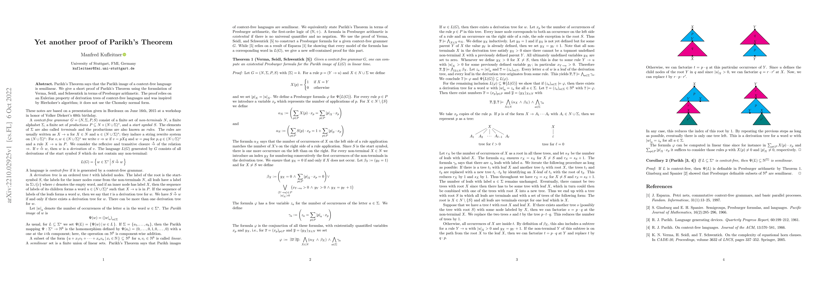 Summary: This paper presents a concise proof of Parikh's Theorem utilizing Presburger arithmetic and an Eulerian property of derivation trees, inspired by Hierholzer's algorithm, bypassing the traditional Chomsky normal form.