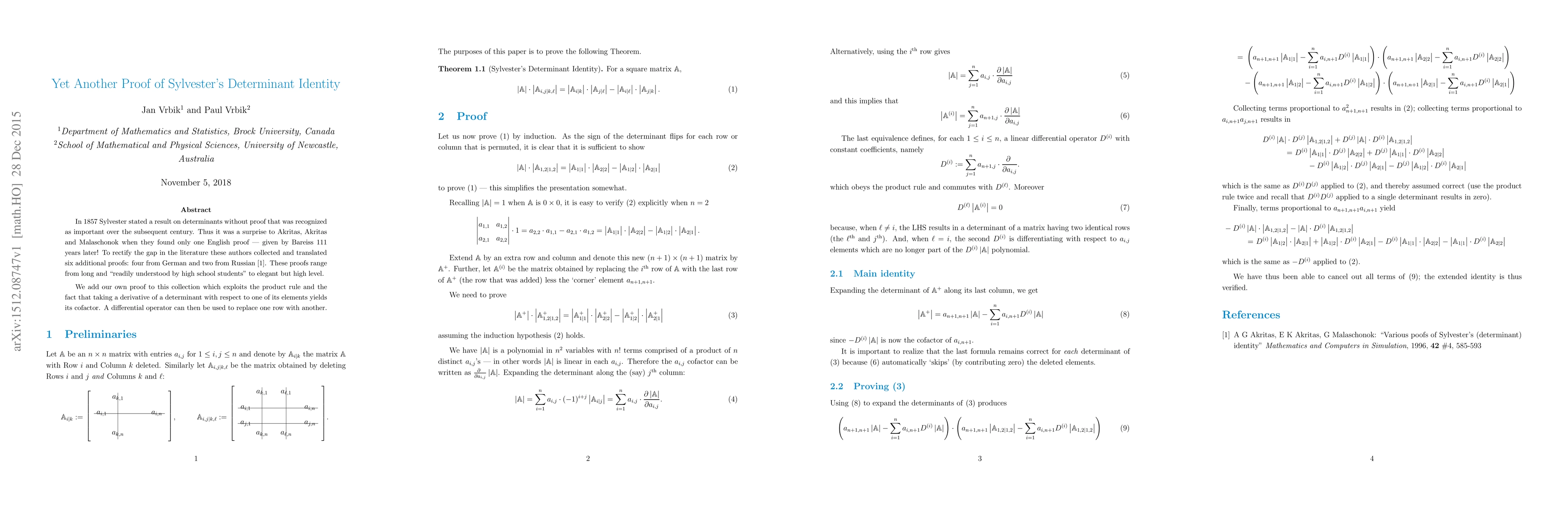Researchers collected and translated six additional proofs of Sylvester's determinant identity, adding a new proof that uses calculus to simplify the process.