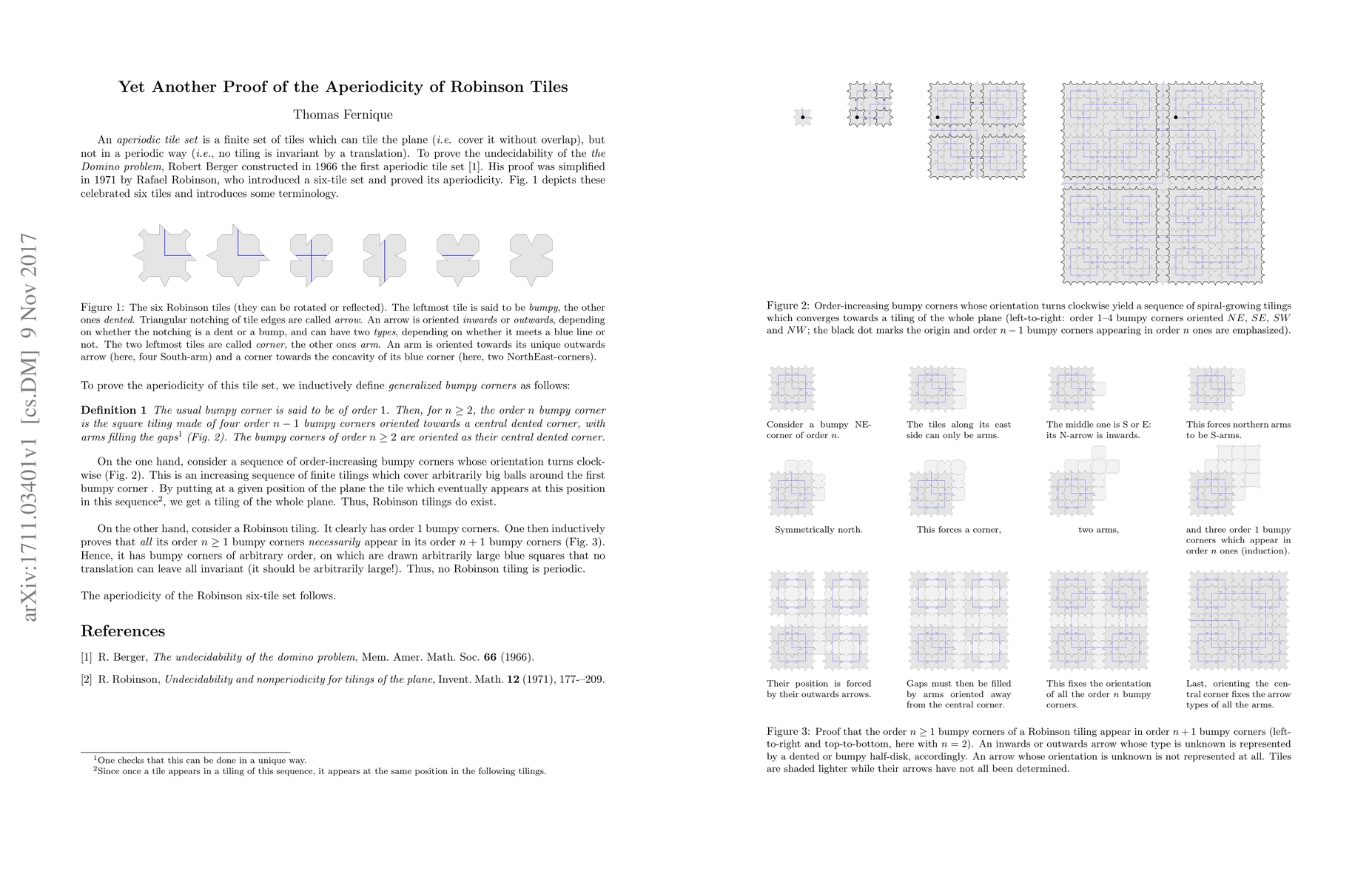 Summary: This paper presents a concise proof demonstrating the aperiodic nature of the Robinson tile set, contributing to the understanding of non-repeating patterns in tiling. The simplicity of the proof enhances the accessibility of this fundamental concept in mathematical tiling theory.