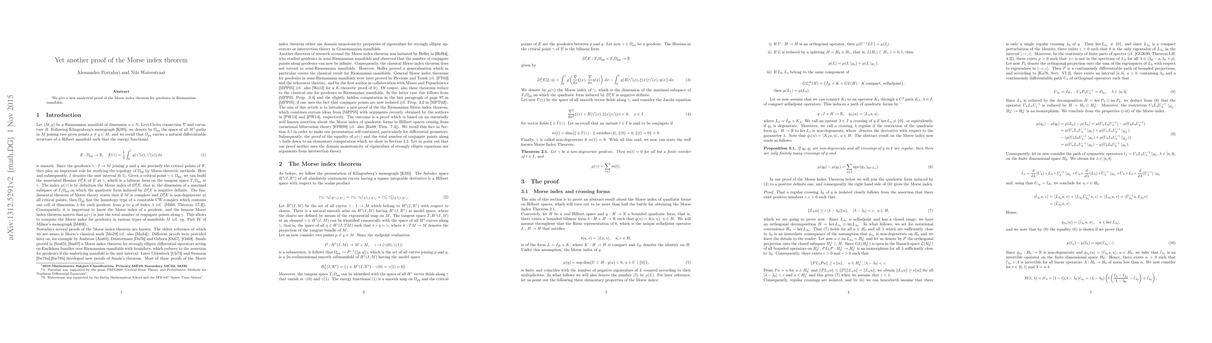 Summary: This paper presents a novel analytical proof of the Morse index theorem, specifically applied to geodesics within Riemannian manifolds. The approach focuses on new analytical techniques.