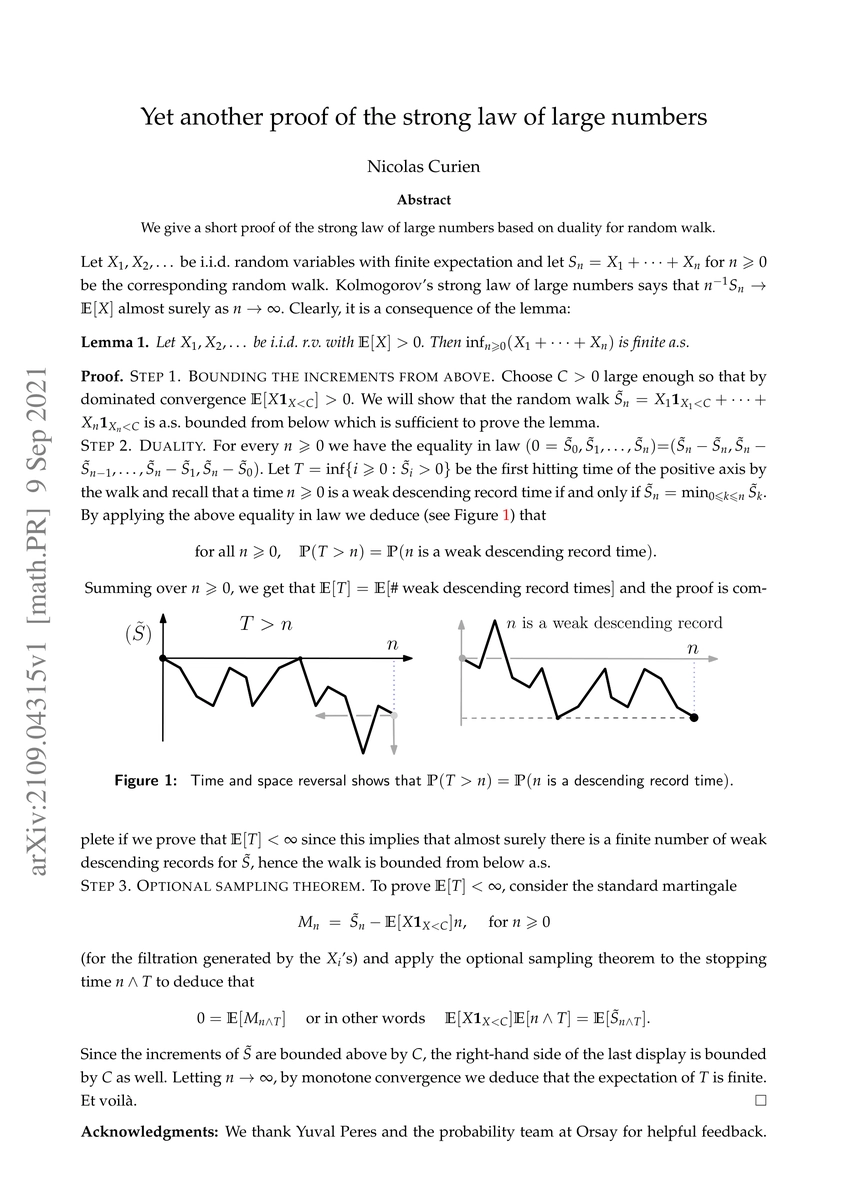 This paper provides a concise proof of the strong law of large numbers using random walks, demonstrating its applicability to probability theory.