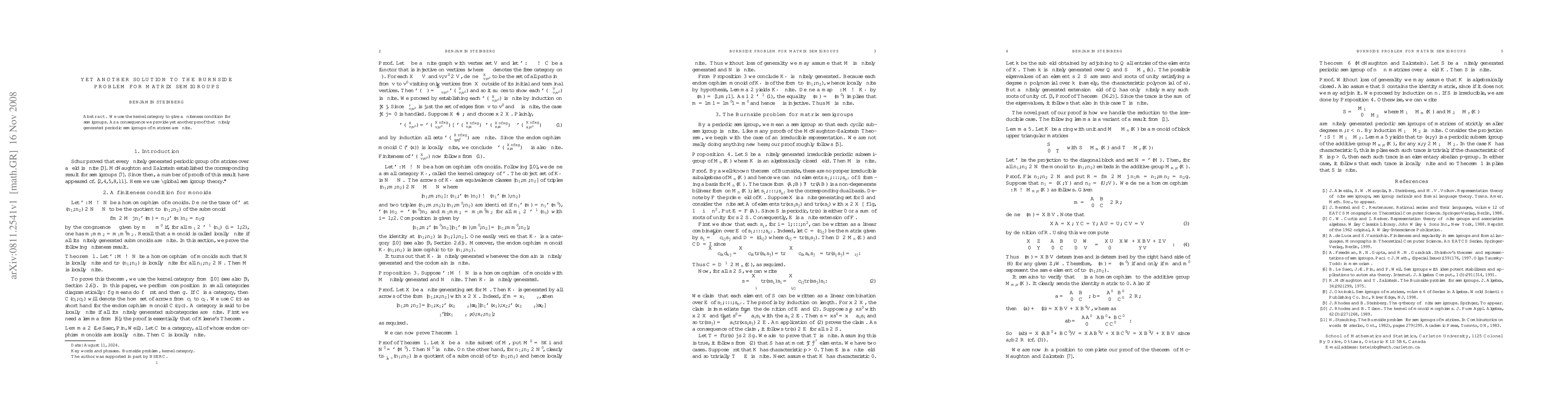 This paper uses the kernel category to prove that finitely generated periodic matrix semigroups are finite, providing another solution to the Burnside problem.