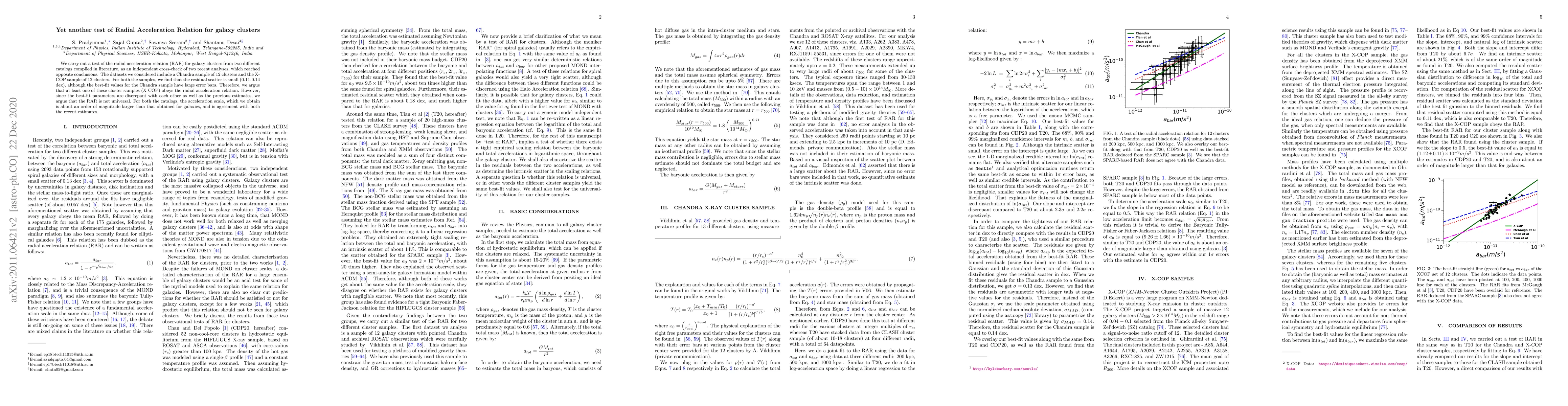We carry out a test of the radial acceleration relation (RAR) for galaxy clusters from two different catalogs compiled in literature, as an independent cross-check of two recent analyses, which reached opposite conclusions. The datasets we considered include a Chandra sample of 12 clusters and the X-COP sample of 12 clusters. For both the samples, we find that the residual scatter is small (0.11-0.14 dex), although the best-fit values for the Chandra sample have large error bars. Therefore, we argue that at least one of these cluster samples (X-COP) obeys the radial acceleration relation. However, since the best-fit parameters are discrepant with each other as well as the previous estimates, we argue that the RAR is not universal. For both the catalogs, the acceleration scale, which we obtain is about an order of magnitude larger than that obtained for galaxies, and is agreement with both the recent estimates.