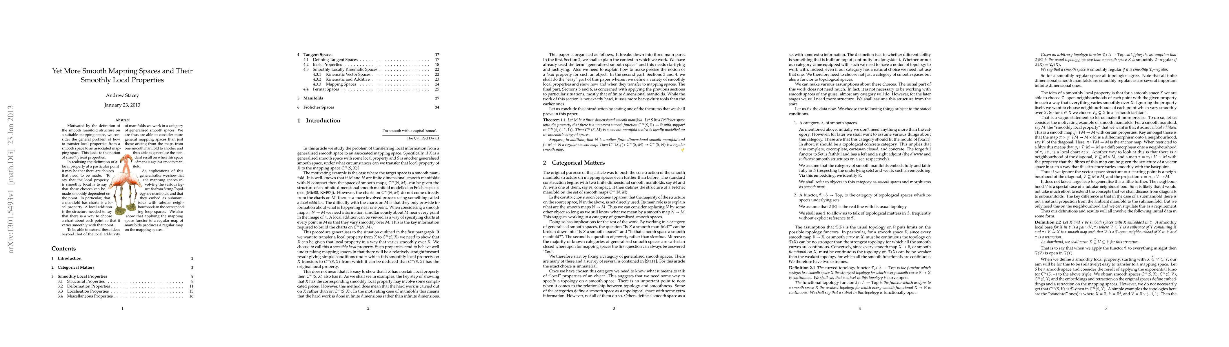 Motivated by the definition of the smooth manifold structure on a suitable mapping space, we consider the general problem of how to transfer local properties from a smooth space to an associated mapping space. This leads to the notion of smoothly local properties. In realising the definition of a local property at a particular point it may be that there are choices that need to be made. To say that the local property is smoothly local is to say that those choices can be made smoothly dependent on the point. In particular, that a manifold has charts is a local property. A local addition is the structure needed to say that there is a way to choose a chart about each point so that it varies smoothly with that point. To be able to extend these ideas beyond that of the local additivity of manifolds we work in a category of generalised smooth spaces. We are thus are able to consider more general mapping spaces than just those arising from the maps from one smooth manifold to another and thus able to generalise the standard result on when this space of maps is again a smooth manifold. As applications of this generalisation we show that the mapping spaces involving the various figure 8s from String Topology are manifolds, and that they embed as submanifolds with tubular neighbourhoods in the corresponding loop spaces. We also show that applying the mapping space functor to a regular map of manifolds produces a regular map on the mapping spaces.