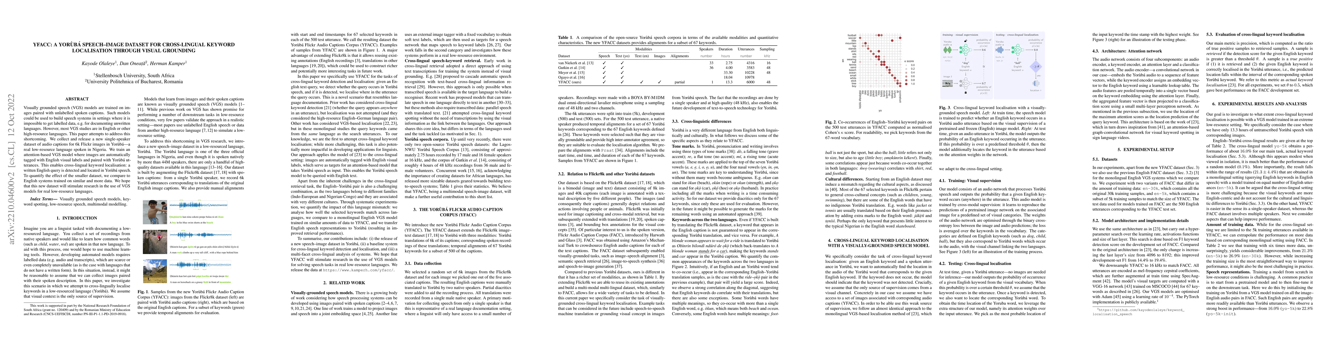This paper introduces YFACC, a Yor\`ub\'a speech-image dataset for cross-lingual keyword localisation, aiming to document unwritten languages. It trains an attention-based visual grounding model to tag images with English labels and Yor\`ub\'a captions, enabling detection of English queries in Yor\`ub\'a speech.