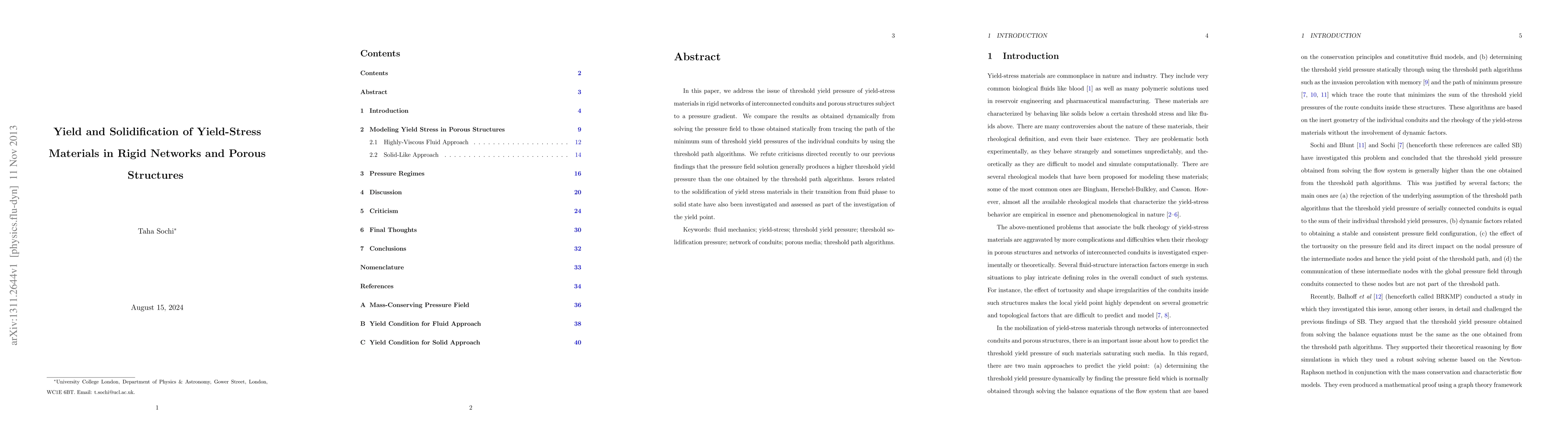 This paper investigates the threshold yield pressure of yield-stress materials in rigid networks and porous structures under pressure gradients, comparing dynamic pressure field solutions with static threshold path algorithms. The study refutes previous criticisms regarding discrepancies in yield pressure measurements and also examines the solidification process of yield-stress materials transitioning from fluid to solid state.