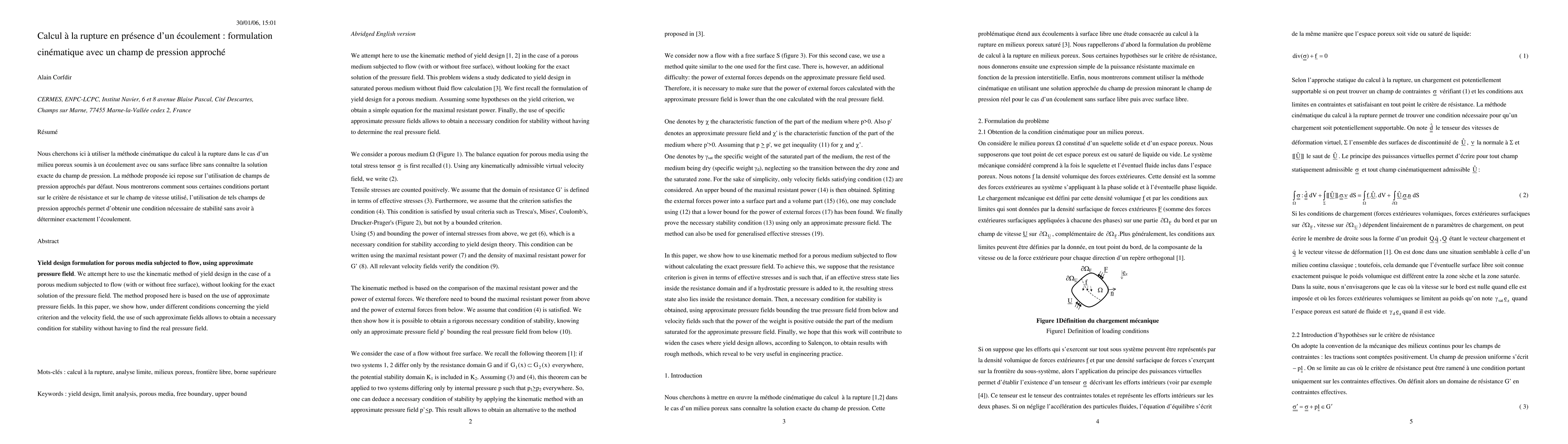 Yield design formulation for porous media subjected to flow, using approximate pressure field. We attempt here to use the kinematic method of yield design in the case of a porous medium subjected to flow (with or without free surface), without looking for the exact solution of the pressure field. The method proposed here is based on the use of approximate pressure fields. In this paper, we show how, under different conditions concerning the yield criterion and the velocity field, the use of such approximate fields allows to obtain a necessary condition for stability without having to find the real pressure field. Nous cherchons ici \`a utiliser la m\'ethode cin\'ematique du calcul \`a la rupture dans le cas d'un milieu poreux soumis \`a un \'ecoulement avec ou sans surface libre sans conna\^itre la solution exacte du champ de pression. La m\'ethode propos\'ee ici repose sur l'utilisation de champs de pression approch\'es par d\'efaut. Nous montrerons comment sous certaines conditions portant sur le crit\`ere de r\'esistance et sur le champ de vitesse utilis\'e, l'utilisation de tels champs de pression approch\'es permet d'obtenir une condition n\'ecessaire de stabilit\'e sans avoir \`a d\'eterminer exactement l'\'ecoulement.