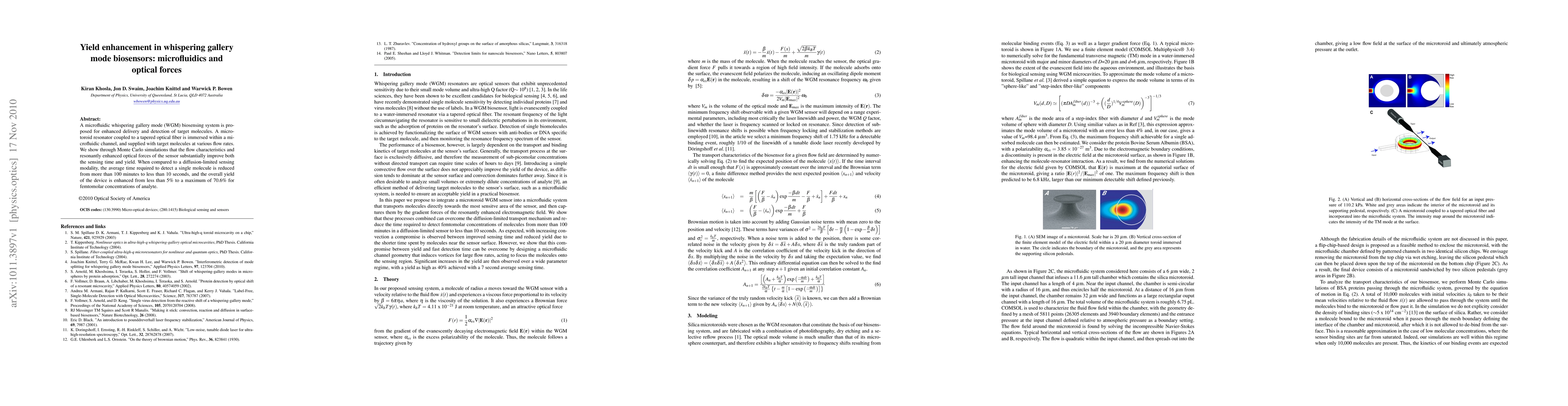 A microfluidic whispering gallery mode (WGM) biosensing system is proposed for enhanced delivery and detection of target molecules. A microtoroid resonator coupled to a tapered optical fiber is immersed within a microfluidic channel, and supplied with target molecules at various flow rates. We show through Monte Carlo simulations that the flow characteristics and resonantly enhanced optical forces of the sensor substantially improve both the sensing time and yield. When compared to a diffusion-limited sensing modality, the average time required to detect a single molecule is reduced from more than 100 minutes to less than 10 seconds, and the overall yield of the device is enhanced from less than 5% to a maximum of 70.6% for femtomolar concentrations of analyte.