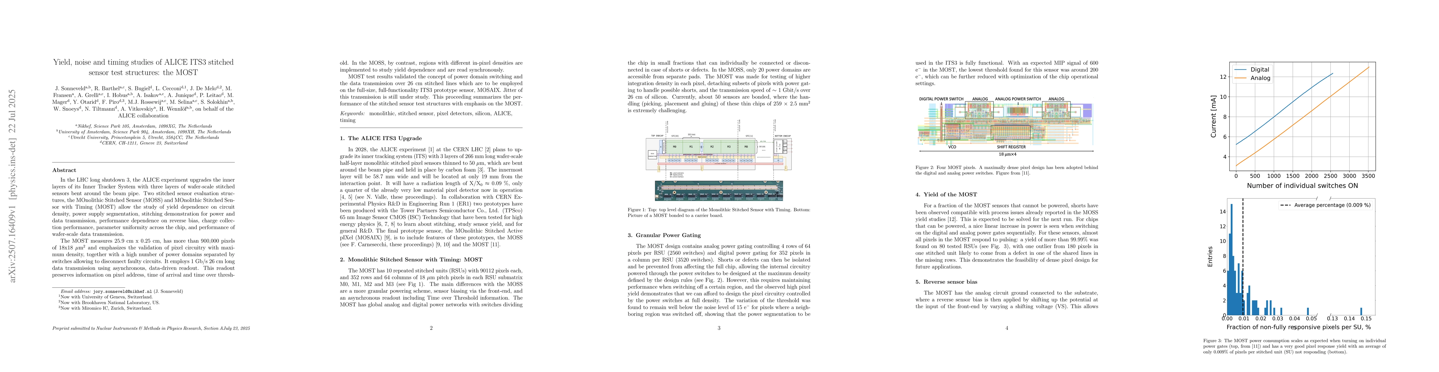 This work introduces and validates the MOST, a stitched sensor structure with high pixel density, multiple power domains, and asynchronous readout, specifically designed for the ALICE experiment's ITS3 upgrade at the LHC.