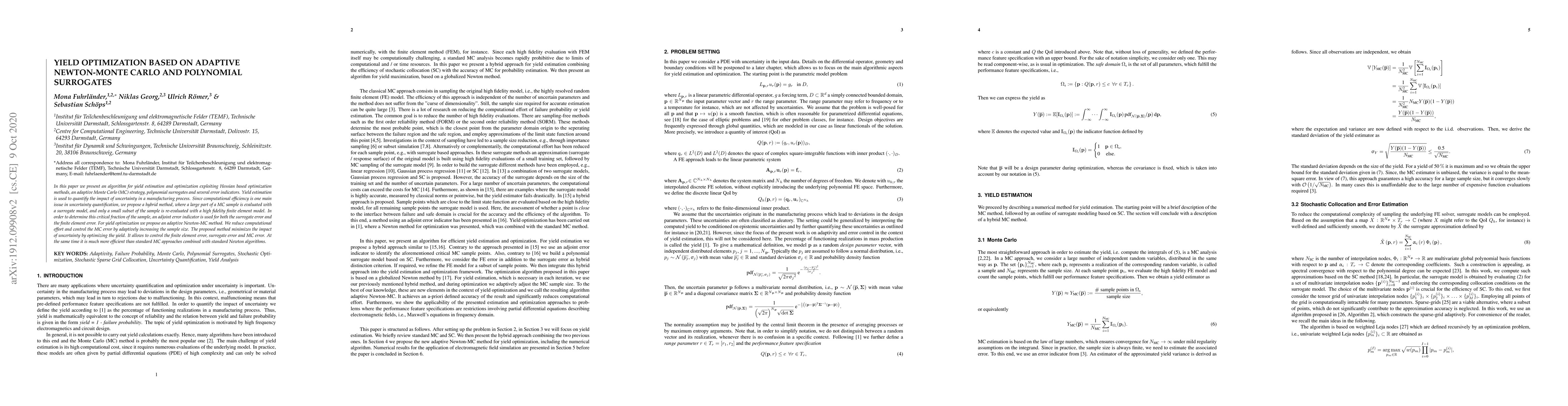 In this paper we present an algorithm for yield estimation and optimization exploiting Hessian based optimization methods, an adaptive Monte Carlo (MC) strategy, polynomial surrogates and several error indicators. Yield estimation is used to quantify the impact of uncertainty in a manufacturing process. Since computational efficiency is one main issue in uncertainty quantification, we propose a hybrid method, where a large part of a MC sample is evaluated with a surrogate model, and only a small subset of the sample is re-evaluated with a high fidelity finite element model. In order to determine this critical fraction of the sample, an adjoint error indicator is used for both the surrogate error and the finite element error. For yield optimization we propose an adaptive Newton-MC method. We reduce computational effort and control the MC error by adaptively increasing the sample size. The proposed method minimizes the impact of uncertainty by optimizing the yield. It allows to control the finite element error, surrogate error and MC error. At the same time it is much more efficient than standard MC approaches combined with standard Newton algorithms.