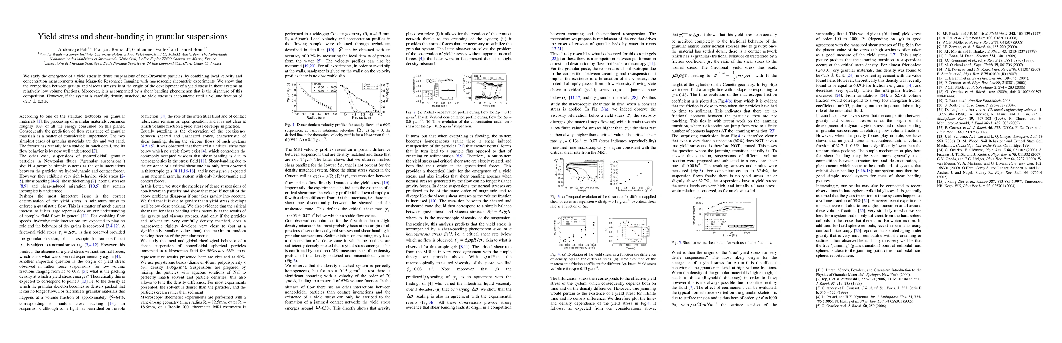 This paper investigates the yield stress in dense granular suspensions, revealing its origin from the competition between gravity and viscous stresses. It also identifies shear banding as a signature of this competition, with no yield stress observed until a critical volume fraction of 62.7 ± 0.3% when density is matched.