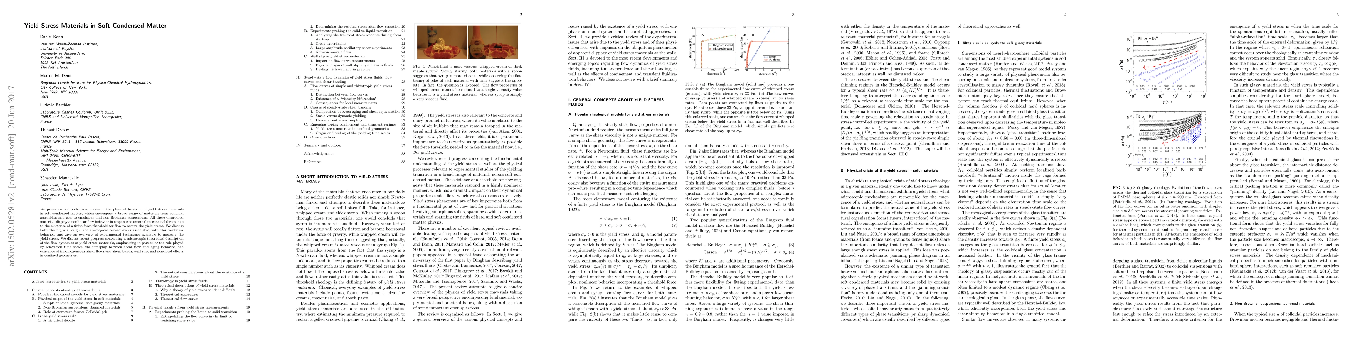 This paper reviews the physical behavior and rheological consequences of yield stress materials in soft condensed matter, highlighting their nonlinear flow response and the role of a finite force threshold. It also discusses recent theoretical advancements and experimental techniques for measuring yield stress, focusing on factors like relaxation time scales and shear banding.