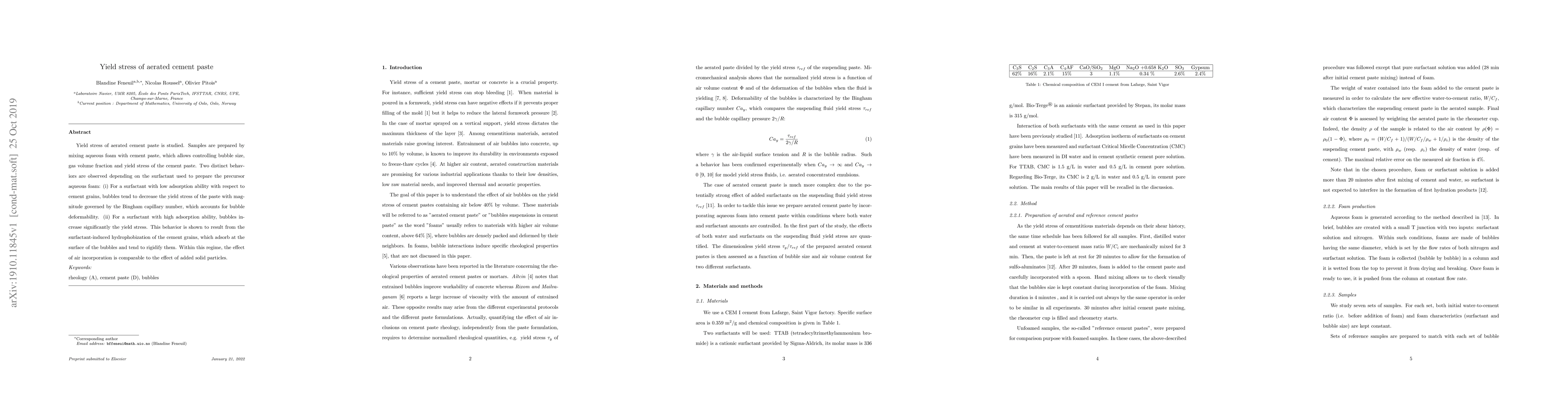 This study investigates the yield stress of aerated cement paste, finding that bubble presence significantly alters the paste's behavior depending on the surfactant used. Low adsorption surfactants reduce yield stress, while high adsorption surfactants increase it due to hydrophobization of cement grains, acting similarly to added solid particles.