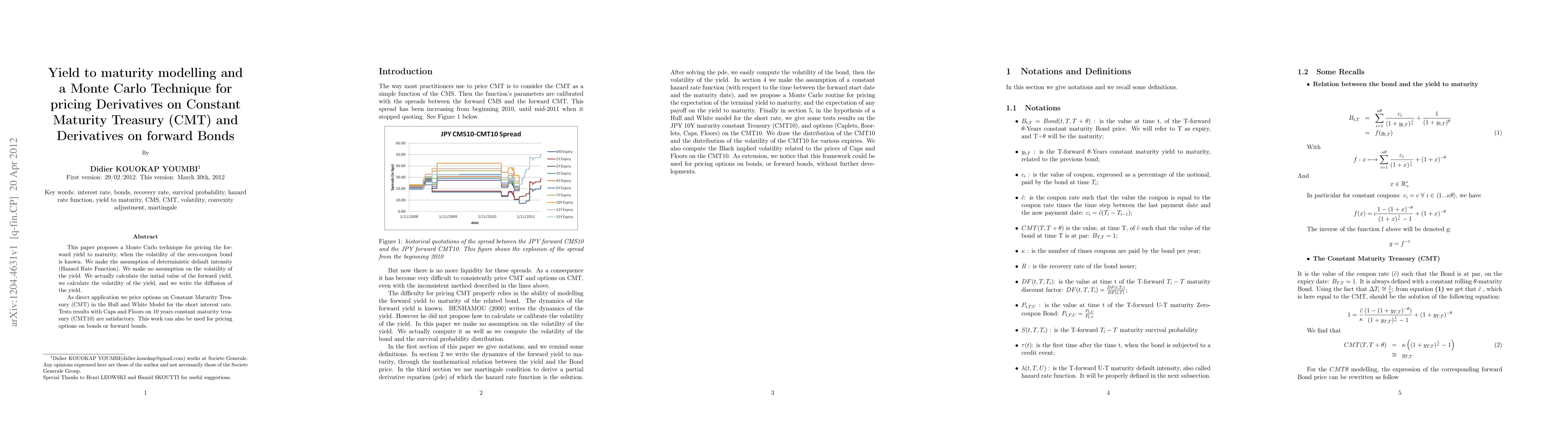 This paper proposes a Monte Carlo technique for pricing the forward yield to maturity, when the volatility of the zero-coupon bond is known. We make the assumption of deterministic default intensity (Hazard Rate Function). We make no assumption on the volatility of the yield. We actually calculate the initial value of the forward yield, we calculate the volatility of the yield, and we write the diffusion of the yield. As direct application we price options on Constant Maturity Treasury (CMT) in the Hull and White Model for the short interest rate. Tests results with Caps and Floors on 10 years constant maturity treasury (CMT10) are satisfactory. This work can also be used for pricing options on bonds or forward bonds.