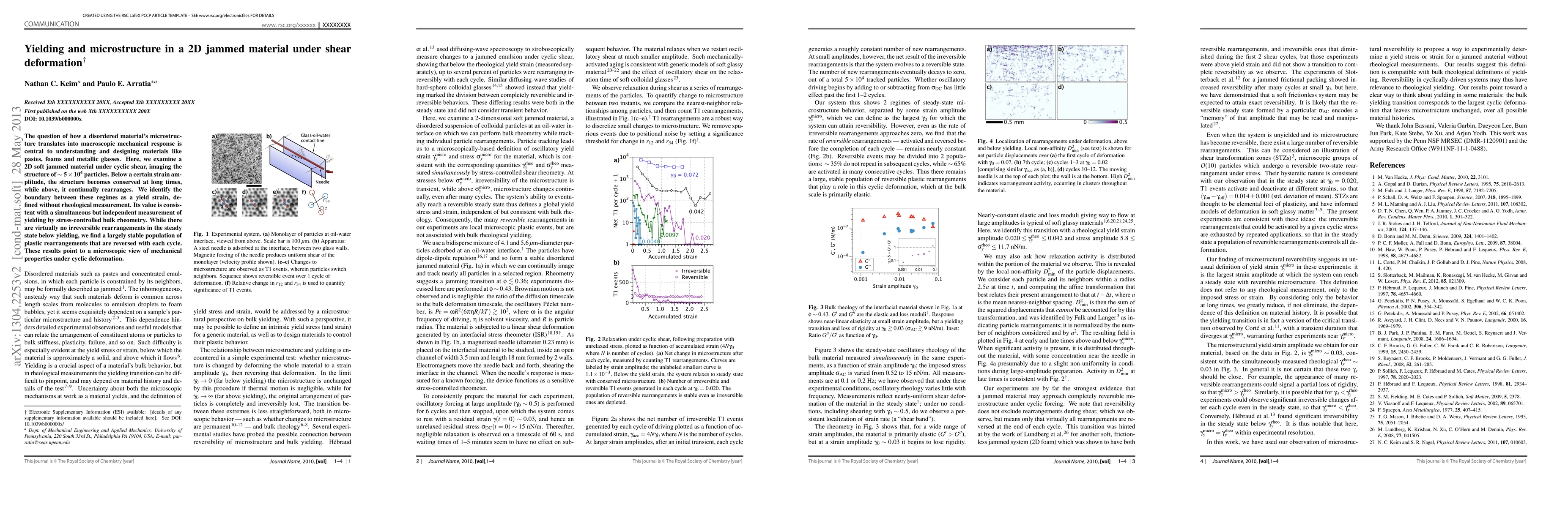 This study investigates the yielding and microstructure of a 2D jammed material under cyclic shear, identifying a yield strain that marks the transition from stable to rearranging particle structures. The findings reveal a stable population of reversible plastic rearrangements below the yield strain, providing insights into the microscopic origins of macroscopic mechanical behavior.