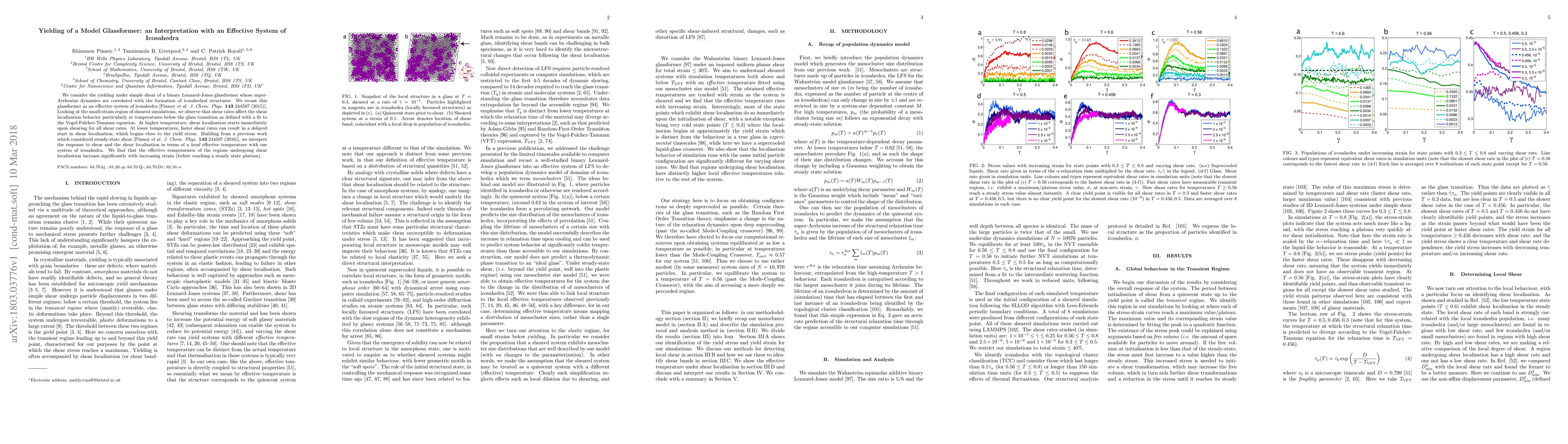 We consider the yielding under simple shear of a binary Lennard-Jones glassformer whose super-Arrhenius dynamics are correlated with the formation of icosahedral structures. We recast this glassformer as an effective system of icosahedra [Pinney et al. J. Chem. Phys. 143 244507 (2015)]. Looking at the small-strain region of sheared simulations, we observe that shear rates affect the shear localisation behavior particularly at temperatures below the glass transition as defined with a fit to the Vogel-Fulcher-Tamman equation. At higher temperature, shear localisation starts immediately upon shearing for all shear rates. At lower temperatures, faster shear rates can result in a delayed start in shear localisation; which begins close to the yield stress. Building from a previous work which considered steady-state shear [Pinney et al. J. Chem. Phys. 143 244507 (2016)], we interpret the response to shear and the shear localisation in terms of a \emph{local} effective temperature with our system of icosahedra. We find that the effective temperatures of the regions undergoing shear localisation increase significantly with increasing strain (before reaching a steady state plateau).