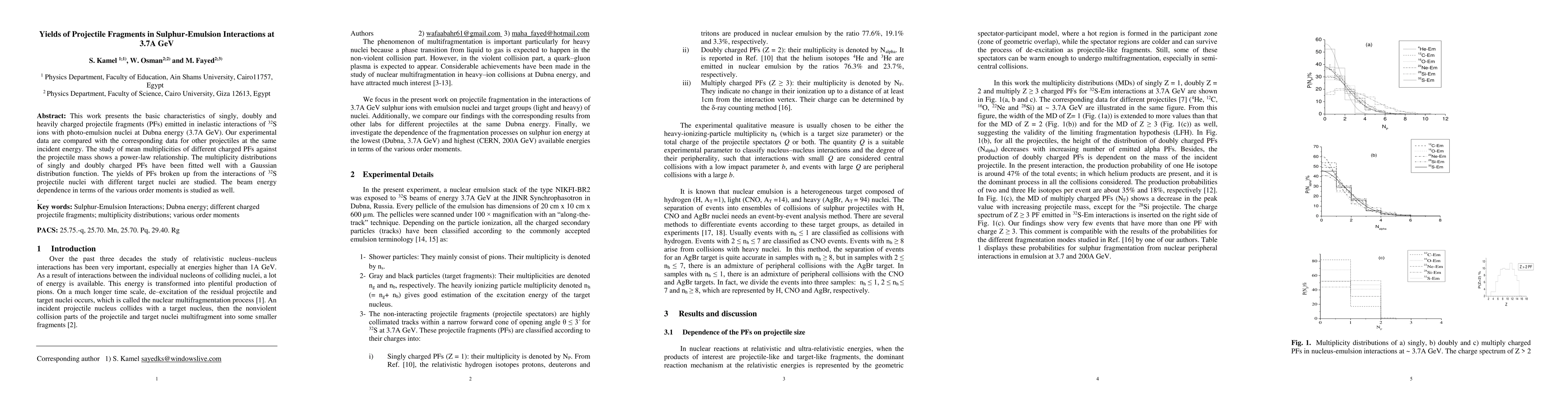 This study investigates the characteristics of projectile fragments from 32S ions interacting with photo-emulsion nuclei at 3.7A GeV, revealing a power-law relationship in mean multiplicities and Gaussian fits for singly and doubly charged fragments. Beam energy dependence is also analyzed through various order moments.