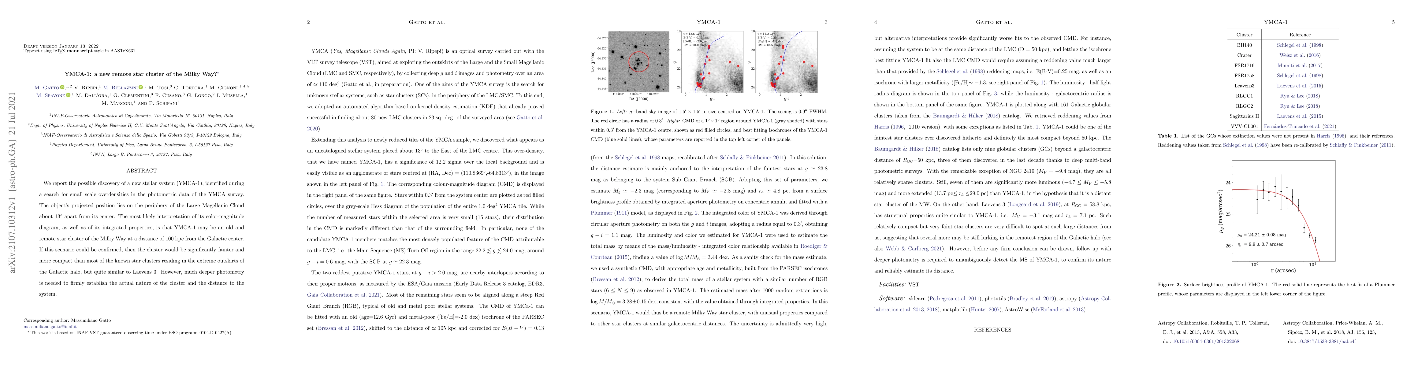 The paper reports the potential discovery of YMCA-1, a new, faint, and compact star cluster possibly located in the Milky Way's outer halo at a distance of 100 kpc from the Galactic center. Further detailed observations are required to confirm its nature and precise distance.