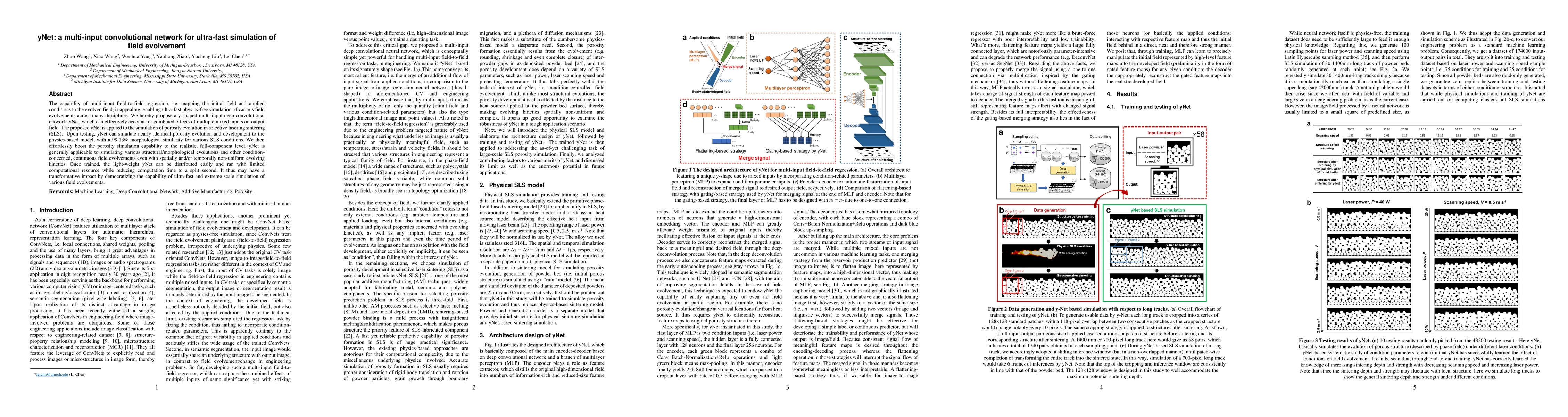 yNet is a multi-input convolutional network designed for ultra-fast simulation of field evolvement, demonstrating high accuracy in porosity evolution simulation in selective laser sintering. Once trained, it offers rapid, resource-efficient simulations applicable across various evolving fields.