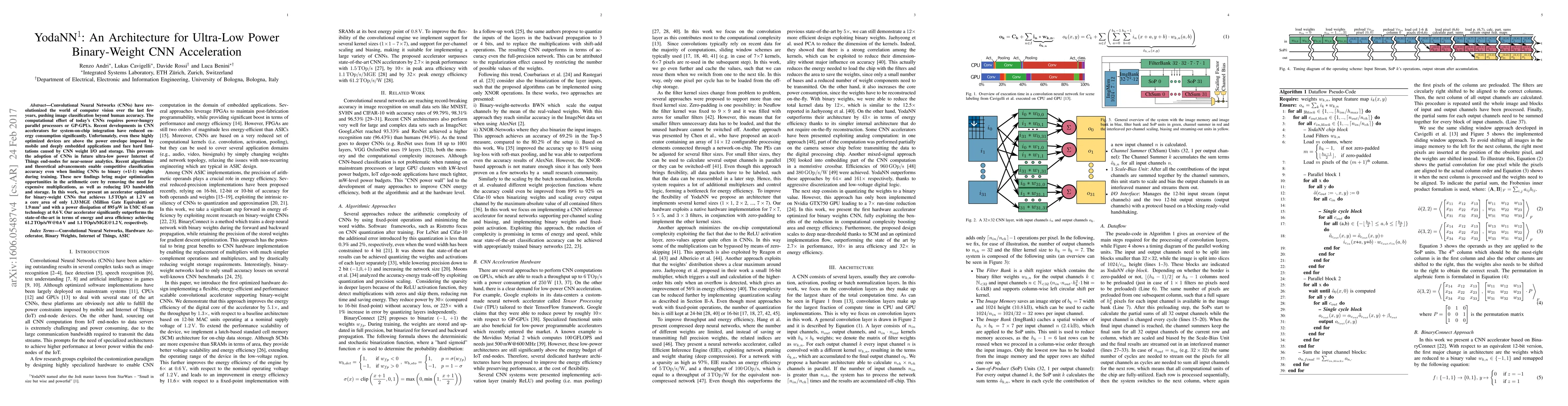 The paper introduces YodaNN, an ultra-low power accelerator architecture for binary-weight CNNs, achieving 1510 GOp/s with 895 μW power dissipation, significantly outperforming existing solutions in energy and area efficiency.