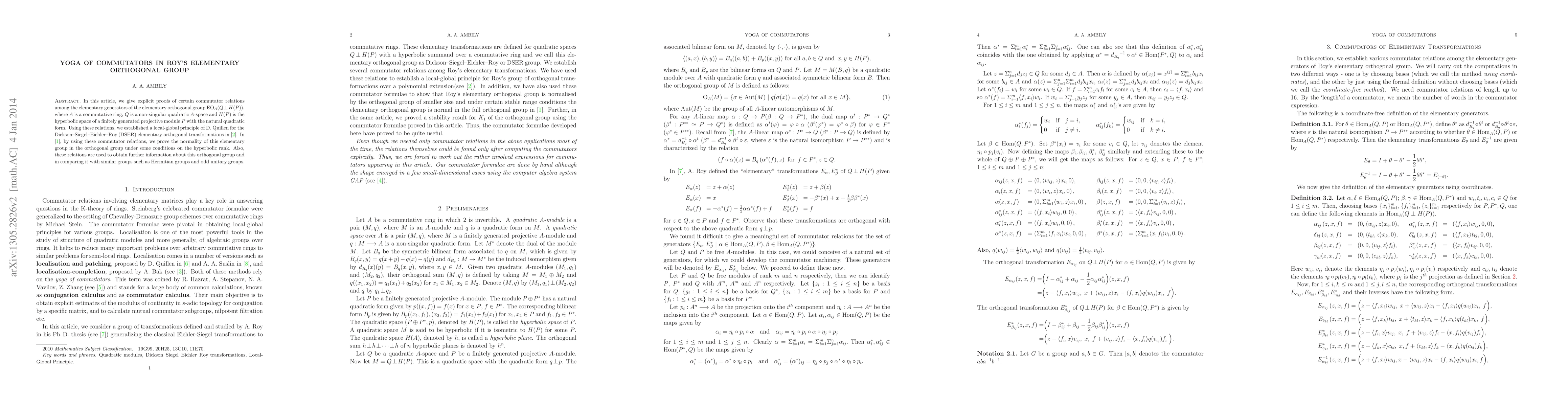 This paper provides explicit proofs of commutator relations among generators of the elementary orthogonal group $EO_A(Q\perp H(P))$, establishing a local-global principle for DSER elementary orthogonal transformations and proving the normality of this group under specific conditions.