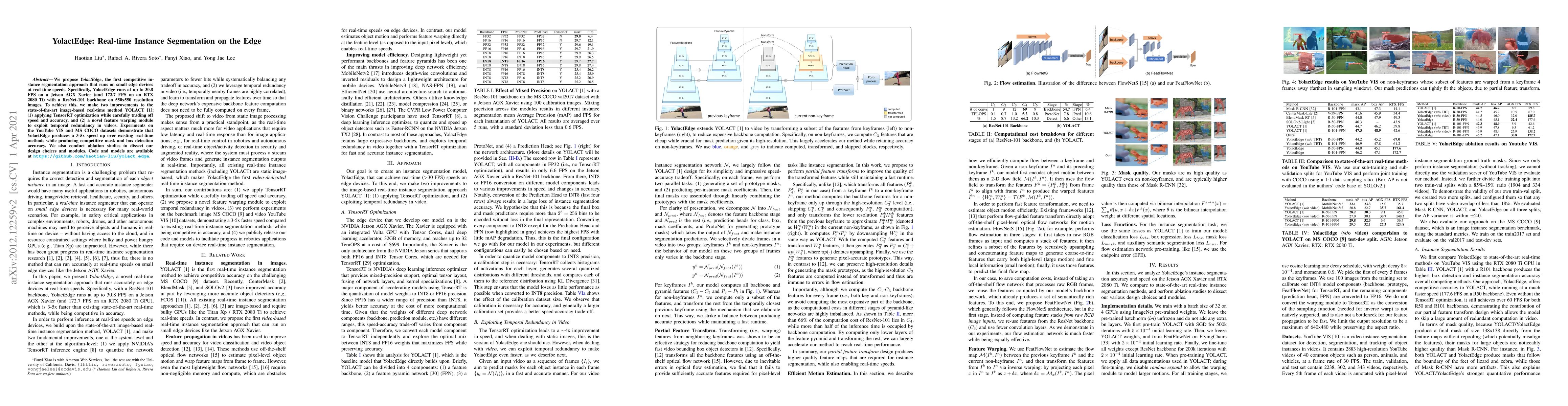 We propose YolactEdge, the first competitive instance segmentation approach that runs on small edge devices at real-time speeds. Specifically, YolactEdge runs at up to 30.8 FPS on a Jetson AGX Xavier (and 172.7 FPS on an RTX 2080 Ti) with a ResNet-101 backbone on 550x550 resolution images. To achieve this, we make two improvements to the state-of-the-art image-based real-time method YOLACT: (1) applying TensorRT optimization while carefully trading off speed and accuracy, and (2) a novel feature warping module to exploit temporal redundancy in videos. Experiments on the YouTube VIS and MS COCO datasets demonstrate that YolactEdge produces a 3-5x speed up over existing real-time methods while producing competitive mask and box detection accuracy. We also conduct ablation studies to dissect our design choices and modules. Code and models are available at https://github.com/haotian-liu/yolact_edge.