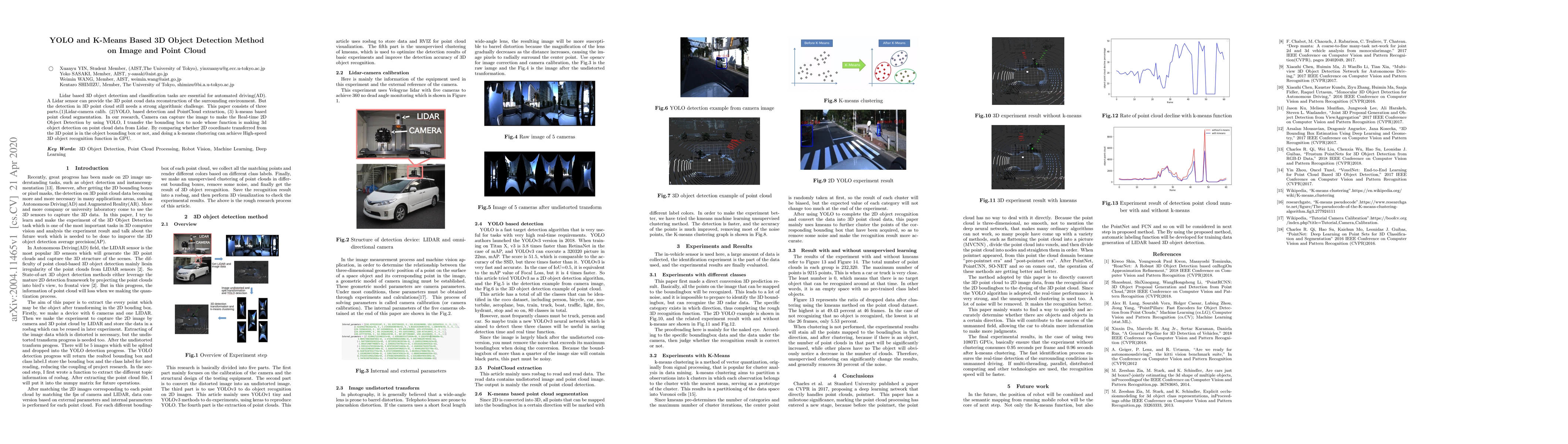 This paper proposes a method for 3D object detection using YOLO for 2D detection from camera images and k-means clustering for 3D point cloud segmentation. The approach integrates Lidar data to enhance 3D detection by leveraging 2D bounding boxes from YOLO for point cloud analysis, achieving high-speed recognition on a GPU.