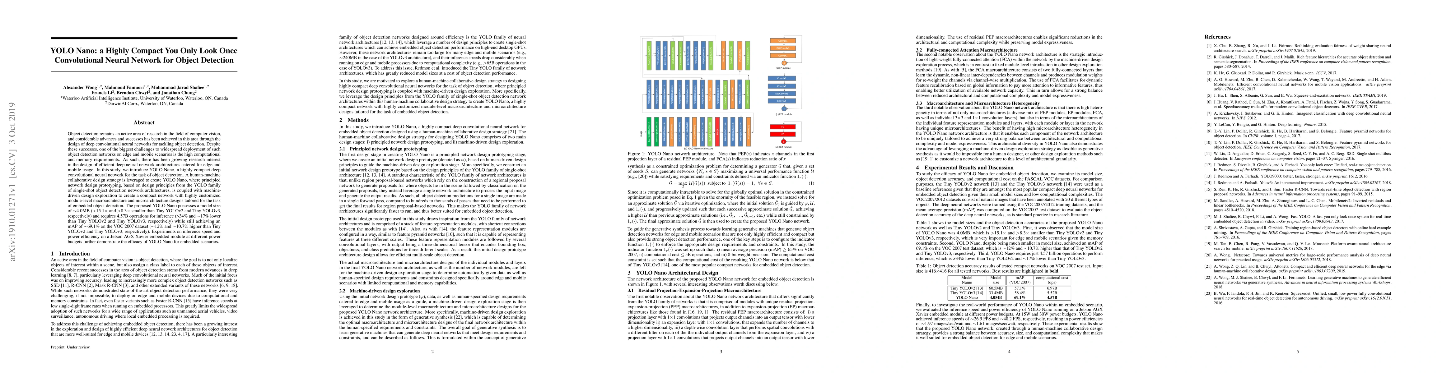 Object detection remains an active area of research in the field of computer vision, and considerable advances and successes has been achieved in this area through the design of deep convolutional neural networks for tackling object detection. Despite these successes, one of the biggest challenges to widespread deployment of such object detection networks on edge and mobile scenarios is the high computational and memory requirements. As such, there has been growing research interest in the design of efficient deep neural network architectures catered for edge and mobile usage. In this study, we introduce YOLO Nano, a highly compact deep convolutional neural network for the task of object detection. A human-machine collaborative design strategy is leveraged to create YOLO Nano, where principled network design prototyping, based on design principles from the YOLO family of single-shot object detection network architectures, is coupled with machine-driven design exploration to create a compact network with highly customized module-level macroarchitecture and microarchitecture designs tailored for the task of embedded object detection. The proposed YOLO Nano possesses a model size of ~4.0MB (>15.1x and >8.3x smaller than Tiny YOLOv2 and Tiny YOLOv3, respectively) and requires 4.57B operations for inference (>34% and ~17% lower than Tiny YOLOv2 and Tiny YOLOv3, respectively) while still achieving an mAP of ~69.1% on the VOC 2007 dataset (~12% and ~10.7% higher than Tiny YOLOv2 and Tiny YOLOv3, respectively). Experiments on inference speed and power efficiency on a Jetson AGX Xavier embedded module at different power budgets further demonstrate the efficacy of YOLO Nano for embedded scenarios.