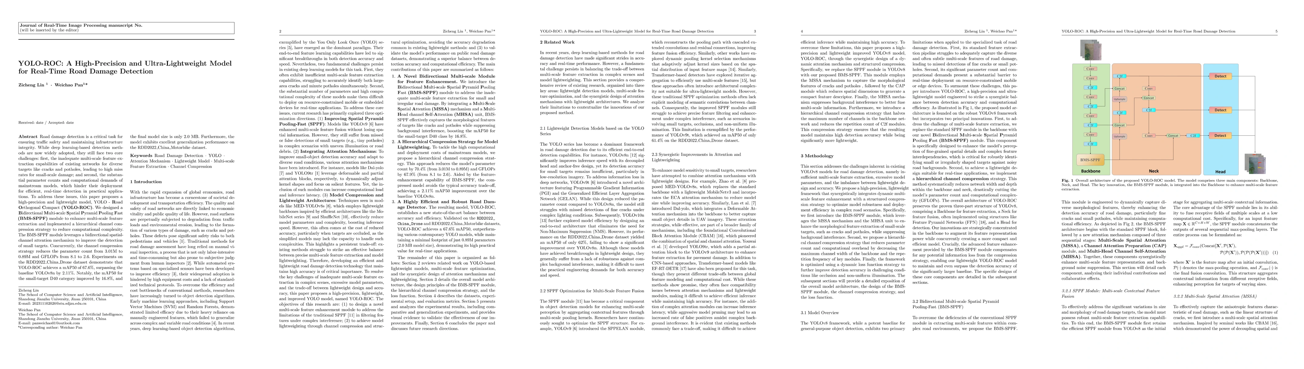 Road damage detection is a critical task for ensuring traffic safety and maintaining infrastructure integrity. While deep learning-based detection methods are now widely adopted, they still face two core challenges: first, the inadequate multi-scale feature extraction capabilities of existing networks for diverse targets like cracks and potholes, leading to high miss rates for small-scale damage; and second, the substantial parameter counts and computational demands of mainstream models, which hinder their deployment for efficient, real-time detection in practical applications. To address these issues, this paper proposes a high-precision and lightweight model, YOLO - Road Orthogonal Compact (YOLO-ROC). We designed a Bidirectional Multi-scale Spatial Pyramid Pooling Fast (BMS-SPPF) module to enhance multi-scale feature extraction and implemented a hierarchical channel compression strategy to reduce computational complexity. The BMS-SPPF module leverages a bidirectional spatial-channel attention mechanism to improve the detection of small targets. Concurrently, the channel compression strategy reduces the parameter count from 3.01M to 0.89M and GFLOPs from 8.1 to 2.6. Experiments on the RDD2022_China_Drone dataset demonstrate that YOLO-ROC achieves a mAP50 of 67.6%, surpassing the baseline YOLOv8n by 2.11%. Notably, the mAP50 for the small-target D40 category improved by 16.8%, and the final model size is only 2.0 MB. Furthermore, the model exhibits excellent generalization performance on the RDD2022_China_Motorbike dataset.