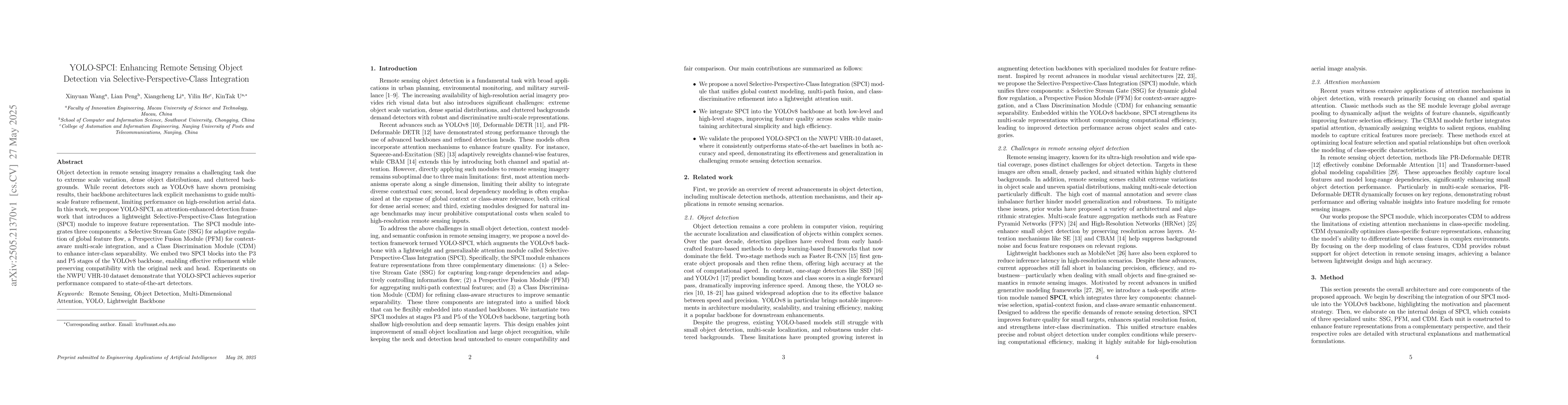 The research proposes YOLO-SPCI, an attention-enhanced detection framework that incorporates a lightweight Selective-Perspective-Class Integration (SPCI) module to refine feature representation in remote sensing imagery. The SPCI module consists of a Selective Stream Gate (SSG), a Perspective Fusion Module (PFM), and a Class Discrimination Module (CDM). Two SPCI blocks are embedded into the P3 and P5 stages of the YOLOv8 backbone.