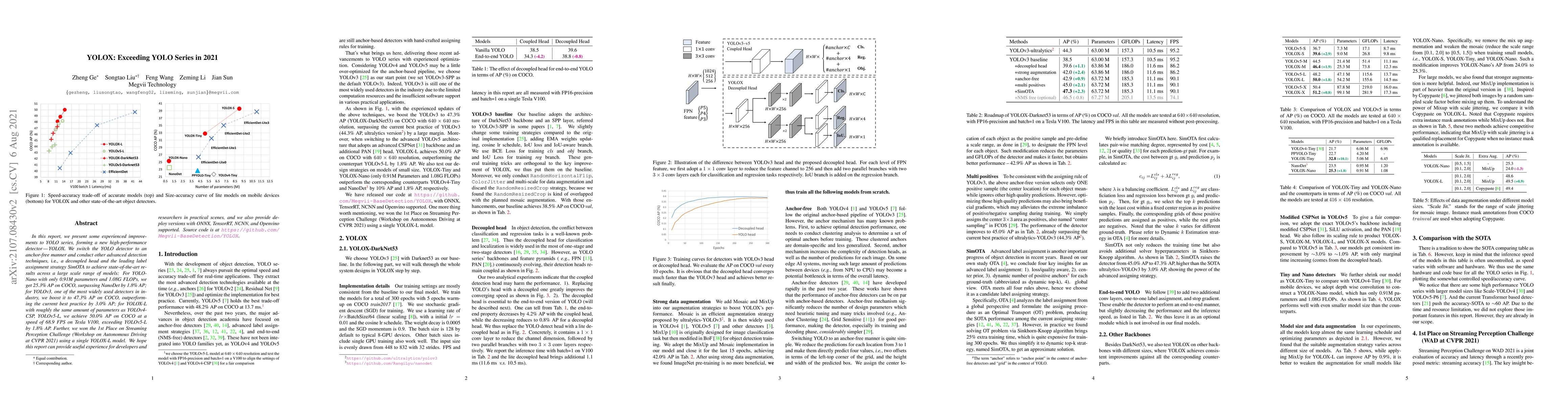 In this report, we present some experienced improvements to YOLO series, forming a new high-performance detector -- YOLOX. We switch the YOLO detector to an anchor-free manner and conduct other advanced detection techniques, i.e., a decoupled head and the leading label assignment strategy SimOTA to achieve state-of-the-art results across a large scale range of models: For YOLO-Nano with only 0.91M parameters and 1.08G FLOPs, we get 25.3% AP on COCO, surpassing NanoDet by 1.8% AP; for YOLOv3, one of the most widely used detectors in industry, we boost it to 47.3% AP on COCO, outperforming the current best practice by 3.0% AP; for YOLOX-L with roughly the same amount of parameters as YOLOv4-CSP, YOLOv5-L, we achieve 50.0% AP on COCO at a speed of 68.9 FPS on Tesla V100, exceeding YOLOv5-L by 1.8% AP. Further, we won the 1st Place on Streaming Perception Challenge (Workshop on Autonomous Driving at CVPR 2021) using a single YOLOX-L model. We hope this report can provide useful experience for developers and researchers in practical scenes, and we also provide deploy versions with ONNX, TensorRT, NCNN, and Openvino supported. Source code is at https://github.com/Megvii-BaseDetection/YOLOX.