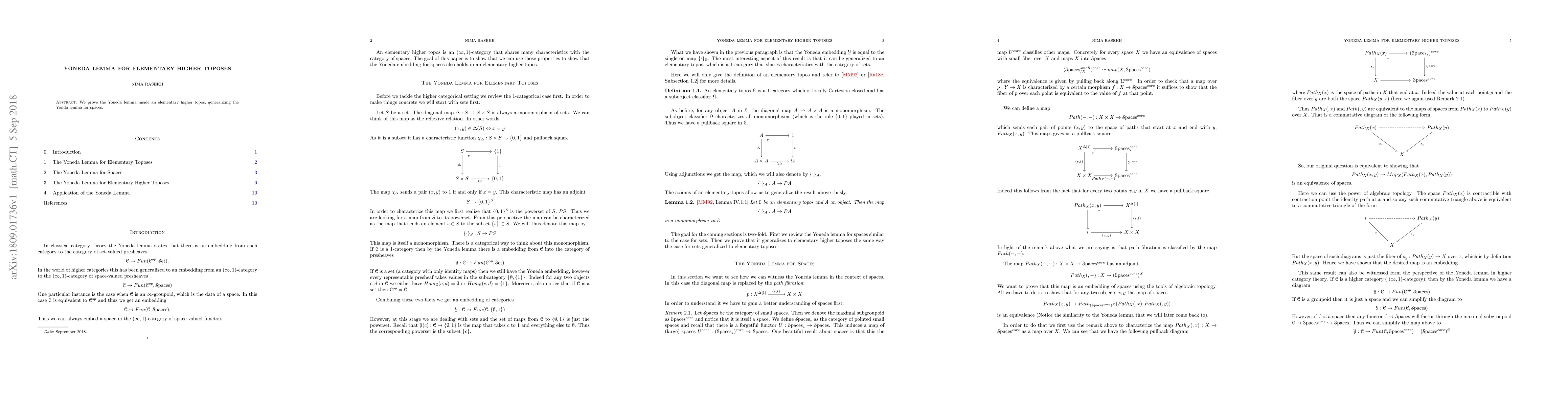 Summary: This paper proves the Yoneda lemma within the framework of elementary higher toposes, extending the classical Yoneda lemma traditionally applicable to spaces. This generalization broadens the lemma's applicability to more complex categorical structures.