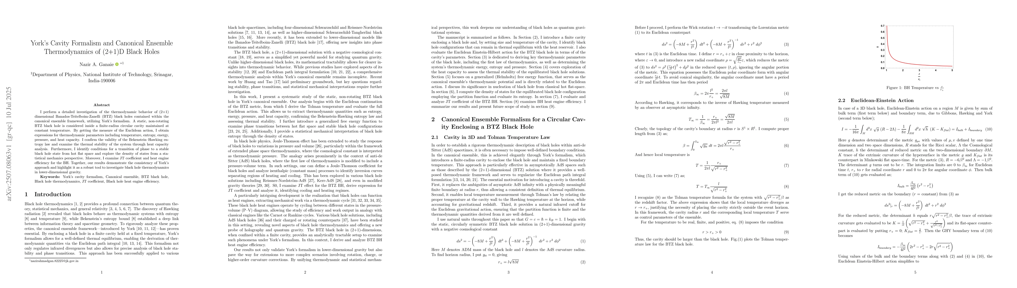 I perform a detailed investigation of the thermodynamic behavior of (2+1) dimensional Banados Teitelboim Zanelli (BTZ) black holes contained within the canonical ensemble framework, utilizing York formalism. A static, non-rotating BTZ black hole is considered inside a finite radius circular cavity maintained at constant temperature. By getting the measure of the Euclidean action, I obtain expressions for thermodynamic parameters including temperature, entropy, energy, pressure, and heat capacity. I confirm the validity of the Bekenstein Hawking entropy law and examine the thermal stability of the system through heat capacity analysis. Furthermore, I identify conditions for a transition of phase to a stable black hole state from hot flat space and explore the density of states from a statistical mechanics perspective. Moreover, I examine JT coefficient and heat engine efficiency for the BH. Together, our results demonstrate the consistency of York approach and highlight it as a robust tool to investigate black hole thermodynamics in lower-dimensional gravity. Keywords: York's cavity formalism, Canonical ensemble, BTZ black hole, Black hole thermodynamics, JT coefficient, Black hole heat engine efficiency.