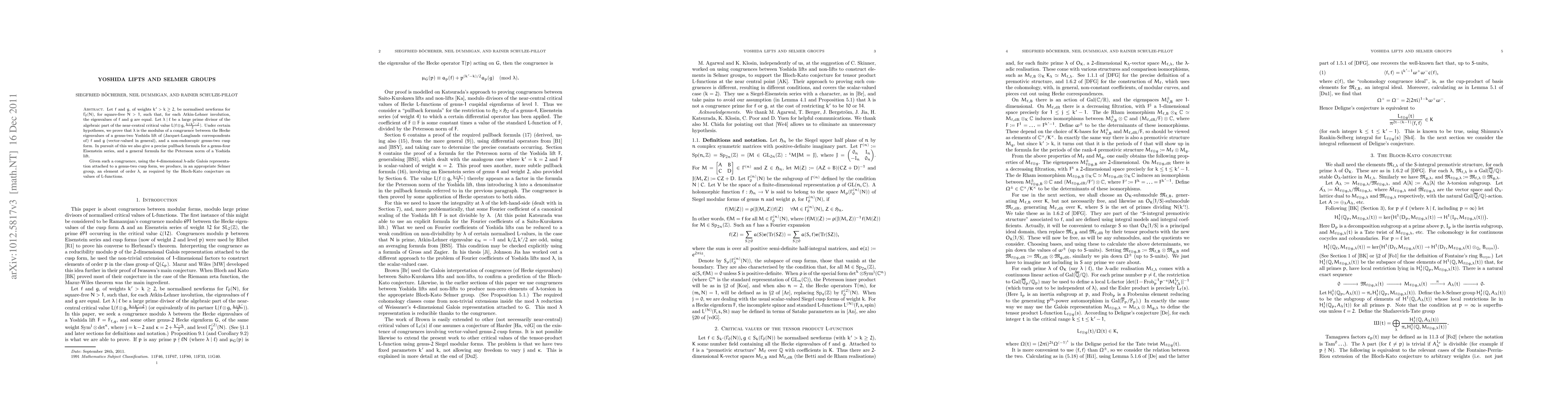 Let $f$ and $g$, of weights $k'>k\geq 2$, be normalised newforms for $\Gamma_0(N)$, for square-free $N>1$, such that, for each Atkin-Lehner involution, the eigenvalues of $f$ and $g$ are equal. Let $\lambda\mid\ell$ be a large prime divisor of the algebraic part of the near-central critical value $L(f\otimes g,\frac{k+k'-2}{2})$. Under certain hypotheses, we prove that $\lambda$ is the modulus of a congruence between the Hecke eigenvalues of a genus-two Yoshida lift of (Jacquet-Langlands correspondents of) $f$ and $g$ (vector-valued in general), and a non-endoscopic genus-two cusp form. In pursuit of this we also give a precise pullback formula for a genus-four Eisenstein series, and a general formula for the Petersson norm of a Yoshida lift. Given such a congruence, using the 4-dimensional $\lambda$-adic Galois representation attached to a genus-two cusp form, we produce, in an appropriate Selmer group, an element of order $\lambda$, as required by the Bloch-Kato conjecture on values of $L$-functions.